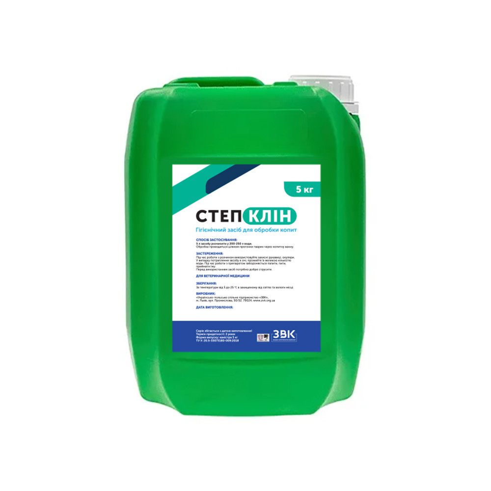 The drug has anti-inflammatory, pain-relieving, wound-healing and antibacterial properties. It has a positive effect on the macerated skin in the areas of the hoof and prevents the development of pathology of the soft structures of the hoof. It has a healing and deodorizing effect on the skin due to significant sorption of the secretion of sweat and sebaceous glands, has antiperspirant properties. Step Klin is a hygienic product for treating hooves. It is used to rehabilitate and strengthen the hoof horn, heal the affected skin. The components of the drug as a whole have anti-inflammatory, pain-relieving, wound-healing and antibacterial properties. It has an astringent, keratolytic and anti-inflammatory effect, stimulates the healing of the affected skin of the soft tissue and interdigital space. Step Klin promotes rapid granulation, stimulates skin healing, has a soothing effect, relieves itching and swelling of the affected areas. Positively affects the macerated skin in the areas of the hoof. Effective for preventing the development of pathology of the soft structures of the hoof. It has a healing and deodorizing effect on the skin in the area of the hoof due to significant sorption of sweat and sebaceous gland secretions, has antiperspirant properties. The product is effective in intense light, when using hard water, in the presence of organic materials. Preparation of the Step Klin working solution: dissolve 5 liters of the product in 200-250 liters of water. Step Klin - is used: for the treatment of purulent-necrotic skin processes in the area of the pulp, corolla, interdigital arch and ulcerative processes of the sole areas - 2 times a day with a frequency of one day (4 times a week); for the treatment of Montelaro's disease (digital dermatitis) - daily, for 10 days; preventively - by immersing the hooves in a pool or disinfectant mats or by running the animals through a hoof bath. Regular use of the product allows you to effectively combat various types of inflammation and cuts on the hooves.Benefits and warranty