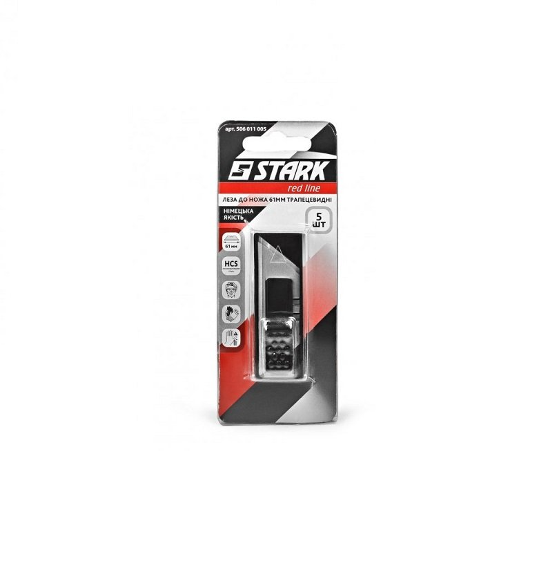 Stark trapezoidal blades, 5 pcs, 61 mm - a set of replacement blades for folding knives. Features of the blade set for construction knives: The set includes 5 blades. Made of high-carbon steel. The length of each blade is 61 mm. Width - 18 mm. Compact body with a retractable blade system. Supplied in blister packaging.Benefits and warranty