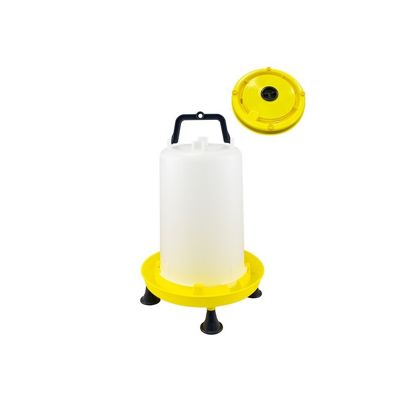 15L siphon drinker with handle, feet and plate with capIt is simple, reliable and ideal for effortlessly supplying clean water to your animals. The 15L siphon drinker with handle, feet and plate with cap is realised in plastic materialcarefully chosen to obtain quality, functional and flexible products. In our choice of materials, we at River Systems comply with all current standards regarding protection of animal health and environmental protection. The 15L siphon drinker with handle, feet and plate with cap consists of the following components. The handlewith ergonomic handle, is made of durable material. A eyelet on the handle allows the user to hang the trough securely. La dome is equipped with 4 supports, designed to accommodate the handle, which give it support and stability when filling. The plate with cap is designed to facilitate the filling phase. The plate should only be unhooked from the siphon during the product cleaning phase. The product design River Systems is meticulously designed to make thesimplest possible use of the product. In fact, the dome has fins at the bottom to fit into the hooks in the plate. The dish, once positioned above the inverted dome, must be turned in the direction indicated by the icons on the bottom. The latter also has an opening that allows water to flow out of the dome and fill the channel in the dish up to the preset height. A set of 4 feet is also provided to be inserted into the appropriate slots at the base of the plate to raise the trough 65 mm above the ground, thus ensuring cleaner water and making it easier for the animals. Lo purpose of this product is on the one hand to make more rapid the usual procurement operations by the farmer, thus saving time and resources. On the other hand allow animals to quench their thirst easily in a context of health and well-being.Benefits and warranty