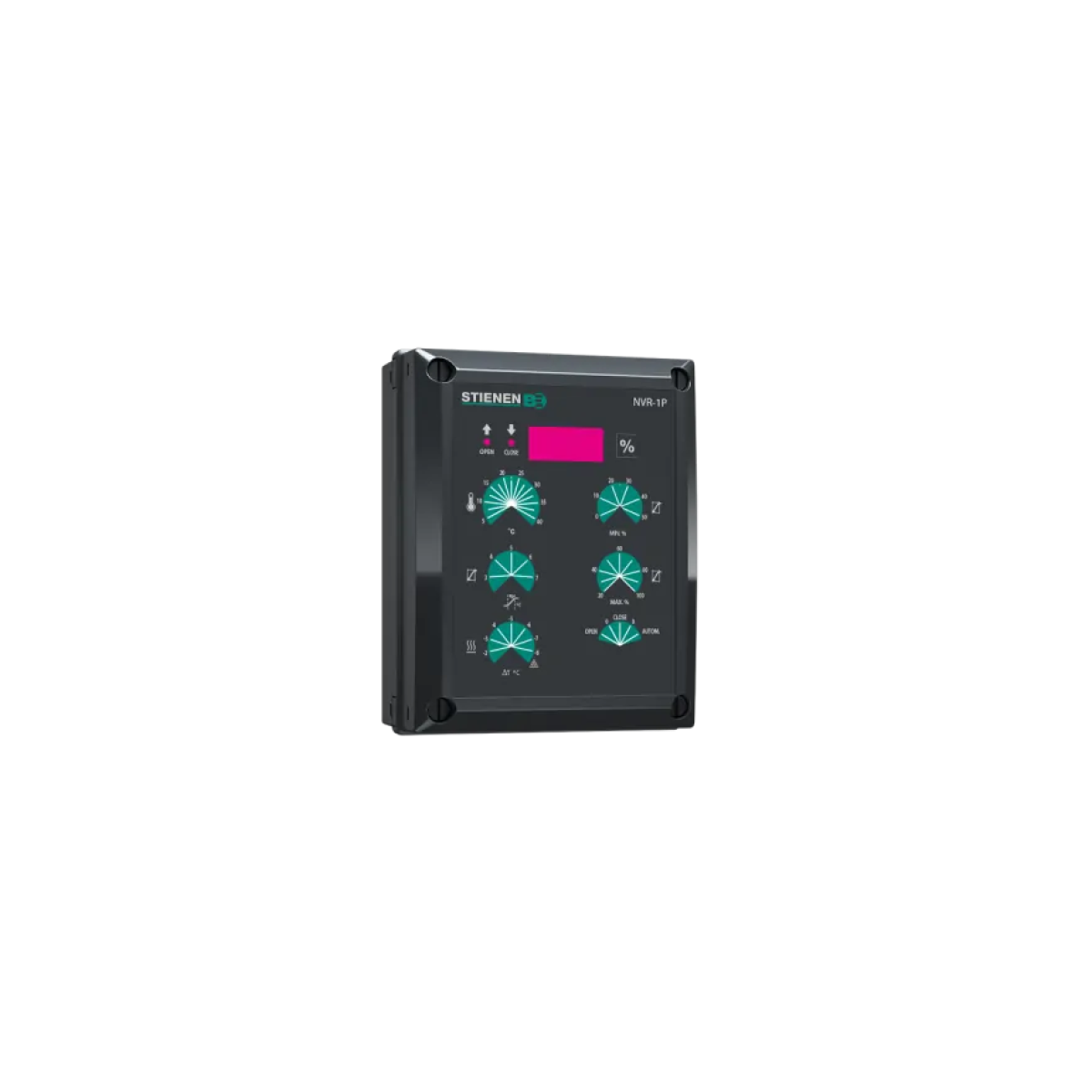 Bandwidth setting: 2,5 - 7,5°C Delay setting: 0,5 - 4 min. For use on a motor with position feedback: + Frost protection: + Heating contact, 230Vac/2A: 1 Housing ABS: + Maximum valve opening setting: 20 - 100%