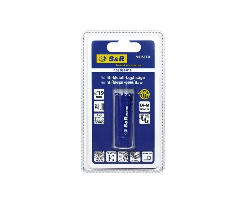Кільцева пилка S&R Meister 22мм HSS-Co8% М42 – біметалічна універсальна кільцева пилка, яку можна використовувати для пилки дерева, гіпсокартону, пластику, сталі, у тому числі і нержавіючої сталі товщиною до 3 мм. Основні переваги кільцевої пилки СР Meister 22 мм: Діаметр коронки – 22 мм, довжина – 50 мм. Виготовлена із міцної сталі. Зубці виготовлені зі швидкорізальної сталі з 8% вмістом кобальту. Зубці розташовані зі змінним кроком 4-6 збців на дюйм. Максимальна глибина пиляння – 38 мм. Для сухого різання. Тривалий термін служби. Поставляється у блістерній упаковці. Країна бренду – Німеччина. Країна виробництва – Китай.Переваги та гарантія