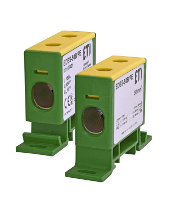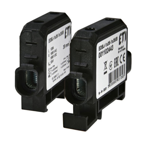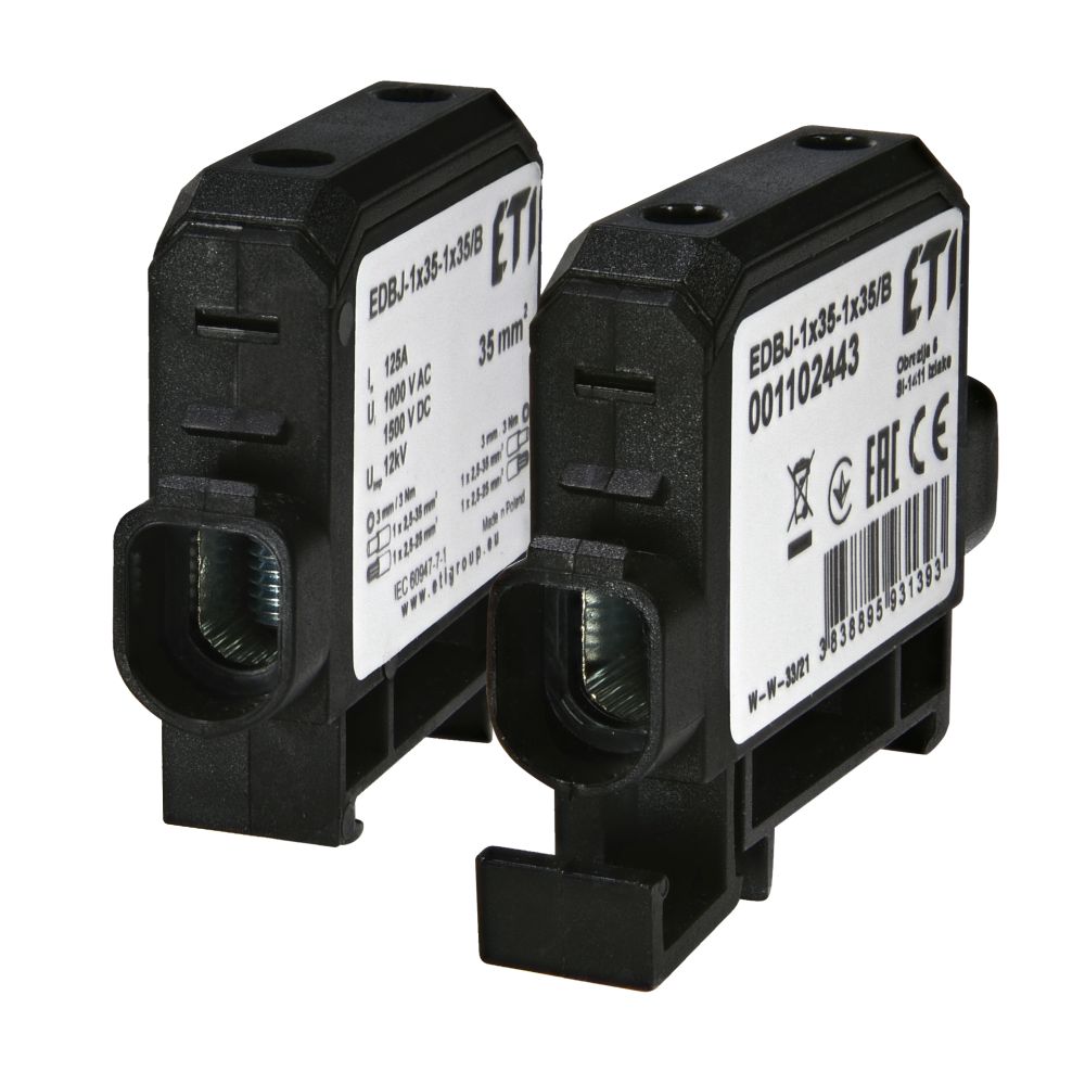 ETI Ввідна силова клема EDBJ-1x35-1x35/B (125 A, 1000 V AC / 1500 V DC) Компактна силова клема з чорним корпусом для підключення кабелів 1×35 мм² на вхід і вихід. Номінал — 125 А, напруга до 1000 В AC або 1500 В DC.Переваги та гарантія