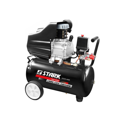 Stark 2525-SAD - масляний поршневий компресор з прямою передачею призначений для побутового використання і невеликих майстерень. Компресор 2525-SAD володіє: Одноступінчастої, одноциліндровий головкою поршневого типу з повітряним охолодженням; Повітряним фільтром для очищення повітря, що потрапляє в головку, від грубозернистої пилу; Індикатором рівня масла; Однофазним електричним двигуном з теплозахистом від перегріву; Великими надійними колесами, що забезпечують легкість транспортування; Ресивером на 25 л. Режим роботи компресора - повторно-короткочасний: при сумарному витраті повітря 50% і більше від максимальної продуктивності компресора - ПВ25; при сумарному витраті повітря 25% і більше від максимальної продуктивності компресора - ПВ40; при сумарному витраті повітря менше 25% від максимальної продуктивності компресора - безперервний. Купивши компресор Stark 2525-SAD, Ви отримаєте надійне обладнання для побутового використання.Переваги та гарантія