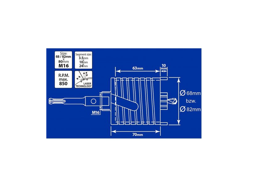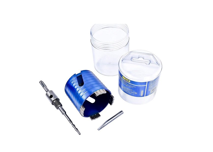Алмазна коронка S&R D72 мм по бетону - професійний інструмент для свердління отворів діаметром 82 мм в бетоні, цеглі, камені. Сумісна з дрелями з патроном SDS-plus. Максимально допустима швидкість роботи з коронкою - 1030 об./хв.. Не допускається свердління інструментом в ударному режимі. Особливості алмазної коронки S&R D72: Виготовлена з міцного металу з напаяними алмазними сегментами, що забезпечує швидку роботу навіть з найбільш твердими поверхнями. У комплекті з коронкою поставляються: центровочне свердло, клин, хвостовик SDS-plus. Габарити інструменту: 185х72 мм. Купити алмазну коронку S&R D72 мм рекомендується для професійного використання.Переваги та гарантія