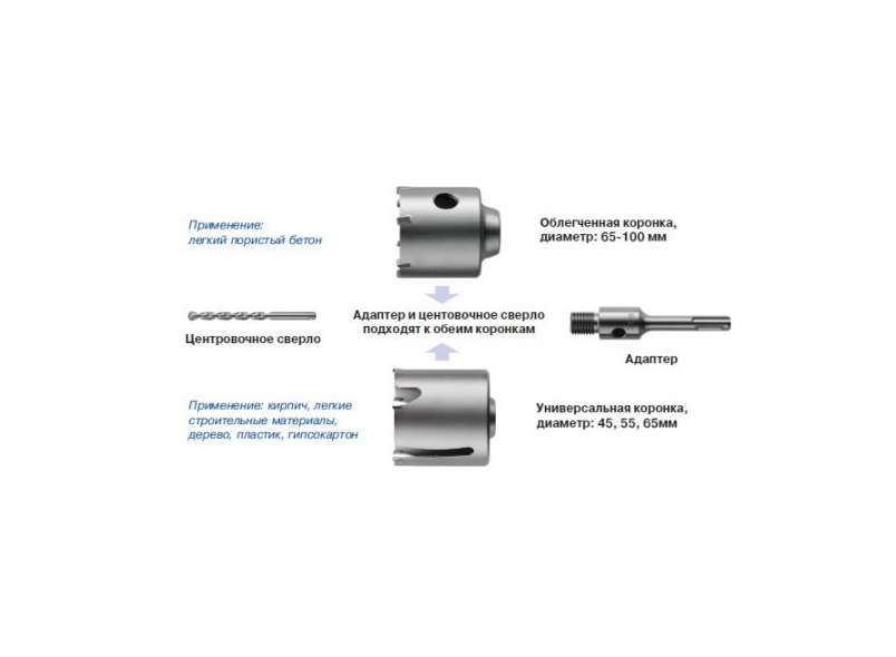 Коронка пустотіла збірна універвальная S & R застосовується для швидкого буріння отворів великого діаметру в пористому бетоні, цегляній кладці, легких будівельних матеріалах, двересіне і пластиці. Збірна коронка дозволяють максимально економити кошти за рахунок можливості використання одного набору приладдя для різних діаметрів коронок. Коронка пустотіла володіє: Зручною швидко полегшеною конструкцією; Спеціальною геометрією ріжучих зубів; Швидкознімним кріпленням центрувальними свердла. Коронка пустотіла збірна універсальна S & R підходить перфораторів від 2-х до 4-х кг з типом патрону SDS-plus або двохпазовим, дрилі з трьохкулачковим патроном і використовується разом з: адаптером з шестигранником з різьбленням М16 ; центрувальні свердлом S & R по цеглині ; центрувальні свердлом S & R по дереву і пластику ; адаптером S & R SDS-plus 118 ; адаптером з шестигранником 118 .Переваги та гарантія