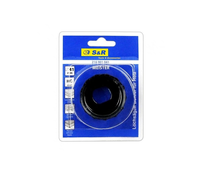 S & R Meister 41 мм - кільцева пила для свердління отворів в деревині. Кільцева пила по дереву використовується як в меблевій промисловості, так і в ремонті, і будівництві. Кільцева пила виготовлена і високовуглецевої сталі, завдяки чому має високу міцність і зносостійкість. Острозаточенного зуби з легкістю прорізають деревину, а також всі деревосодержащіх матеріали: гіпсокартон, фанера, ДСП, ДВП, МДФ. Цілісність коронки забезпечують отвору рівні краї. Кільцева пила S & R Meister 41 мм дозволяє швидко свердлити в деревині отвори дрилем або іншими свердлильними установками.Переваги та гарантія