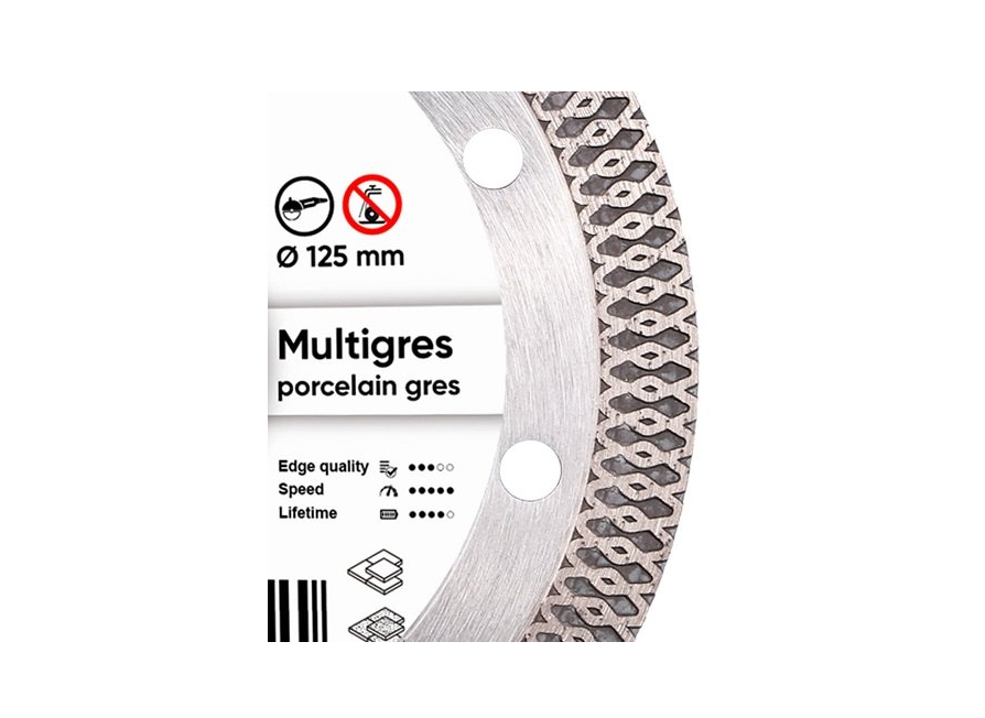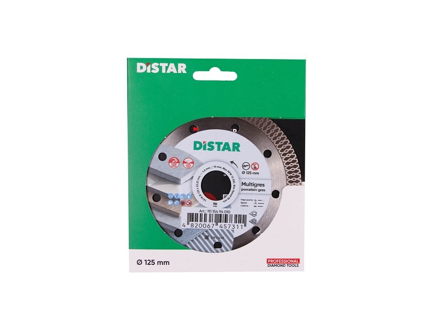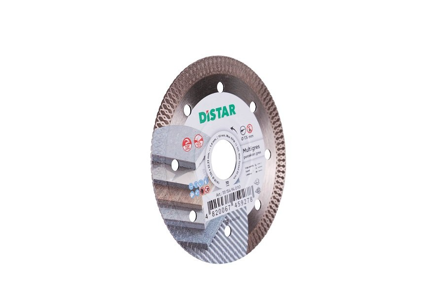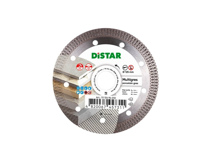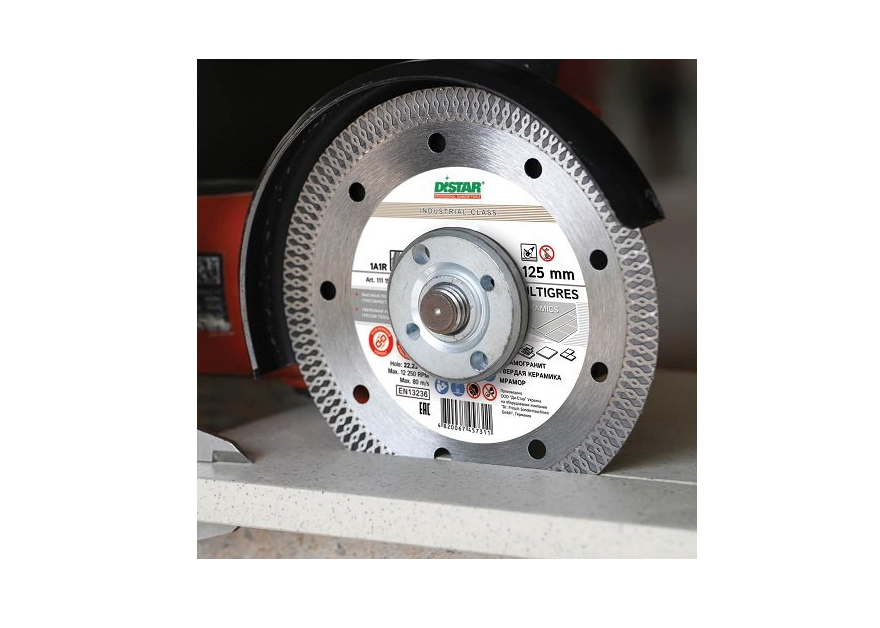 Distar 1A1R Multigres - алмазний диск для різання керамічних і мармурових поверхонь, а також для обробки керамограніта товщиною до 20 мм. Диск обладнаний тонким алмазним шаром 1,4 мм, що забезпечує йому високу швидкість для швидкої обробки безлічі матеріалу. Завдяки отворам на корпусі диск досить добре охолоджується, що дозволяє його використовувати його при сухій різанні і показувати досить високі результати. Використовується диск Distar 1A1R Multigres з кутовими шліфмашинами зі стандартним діаметром посадки 22,2 мм.Переваги та гарантія