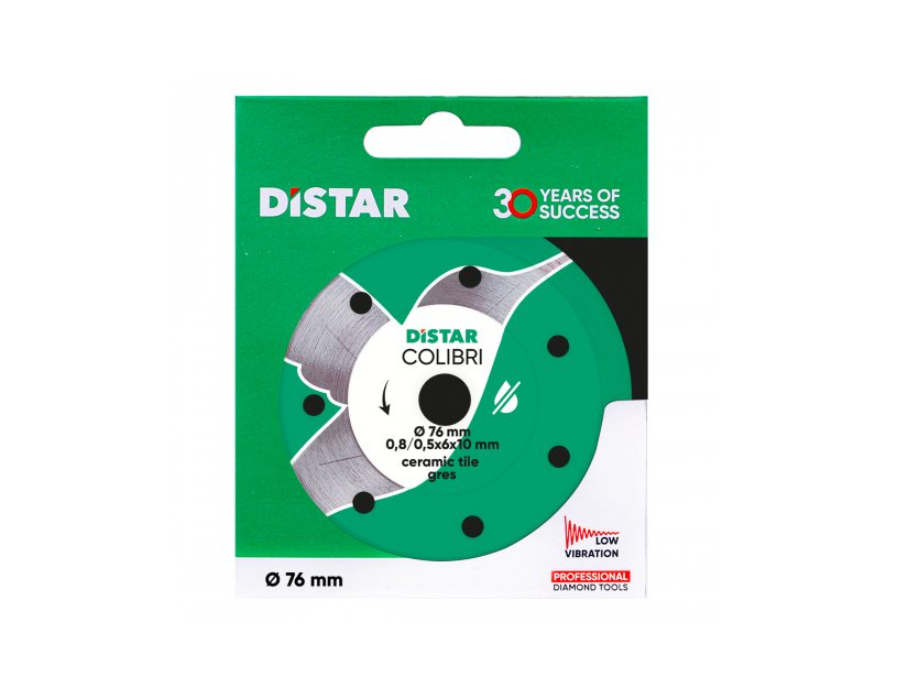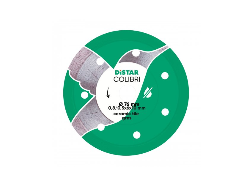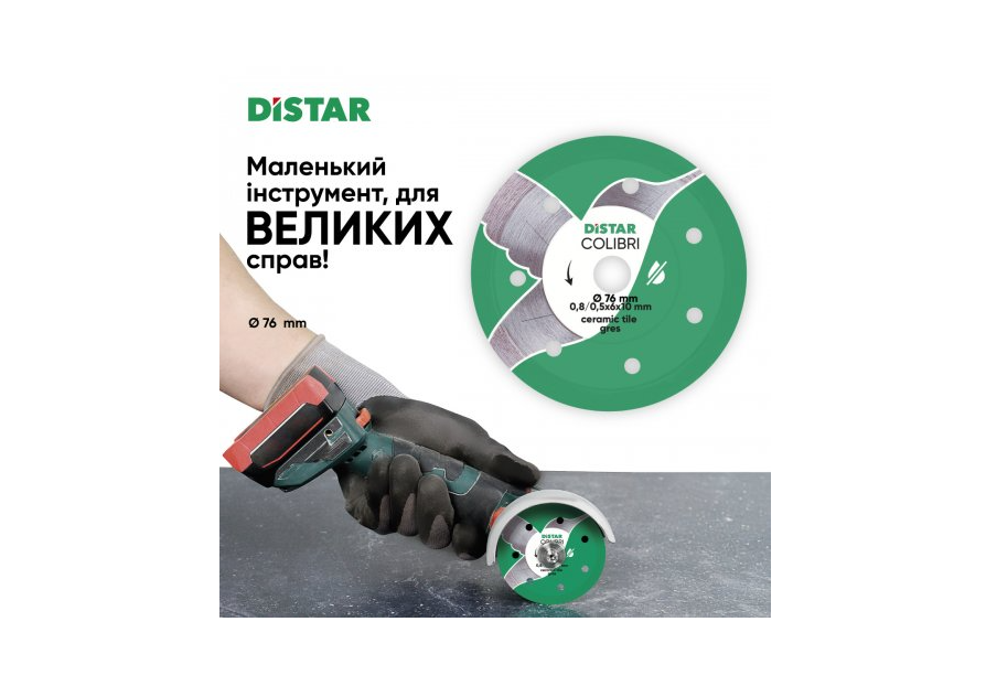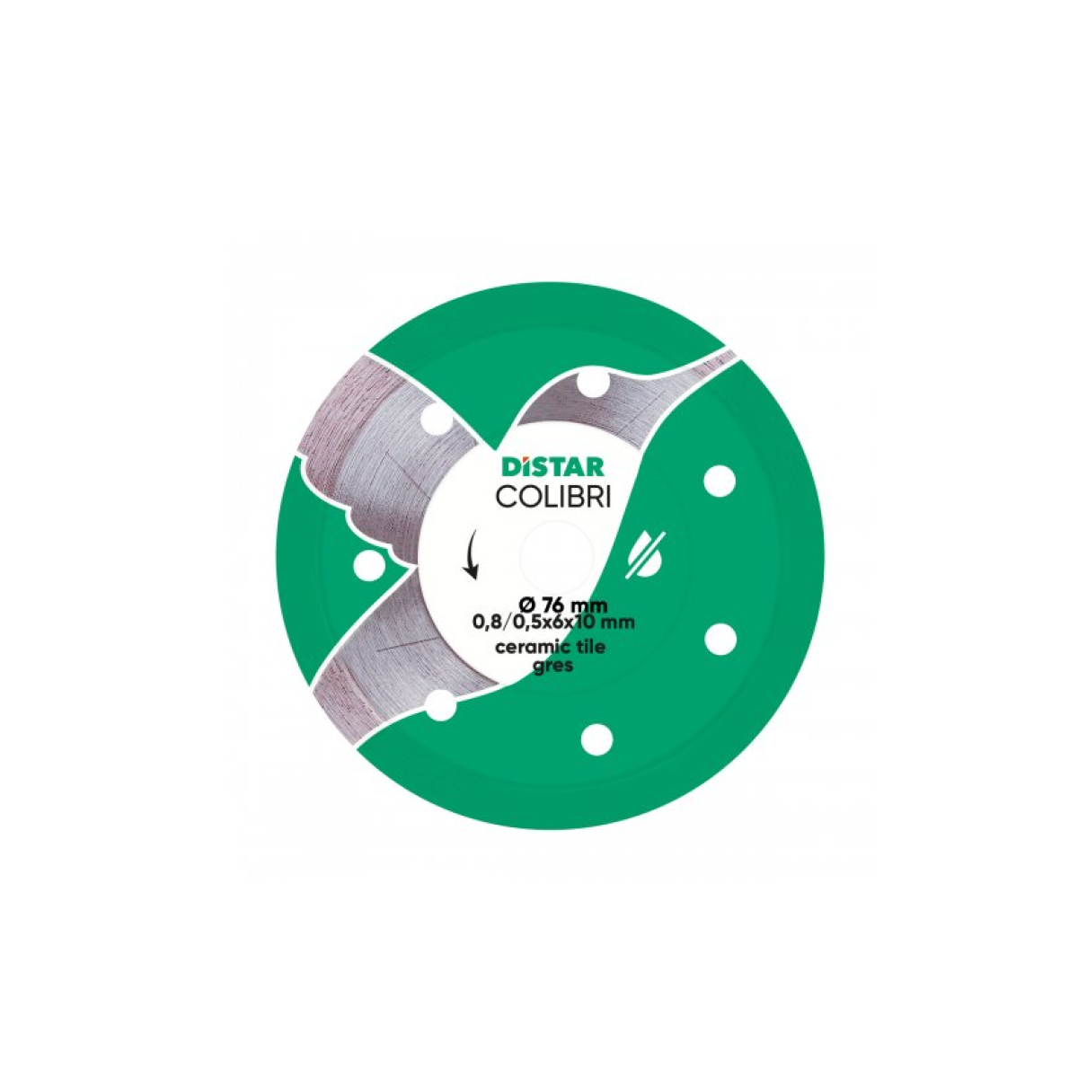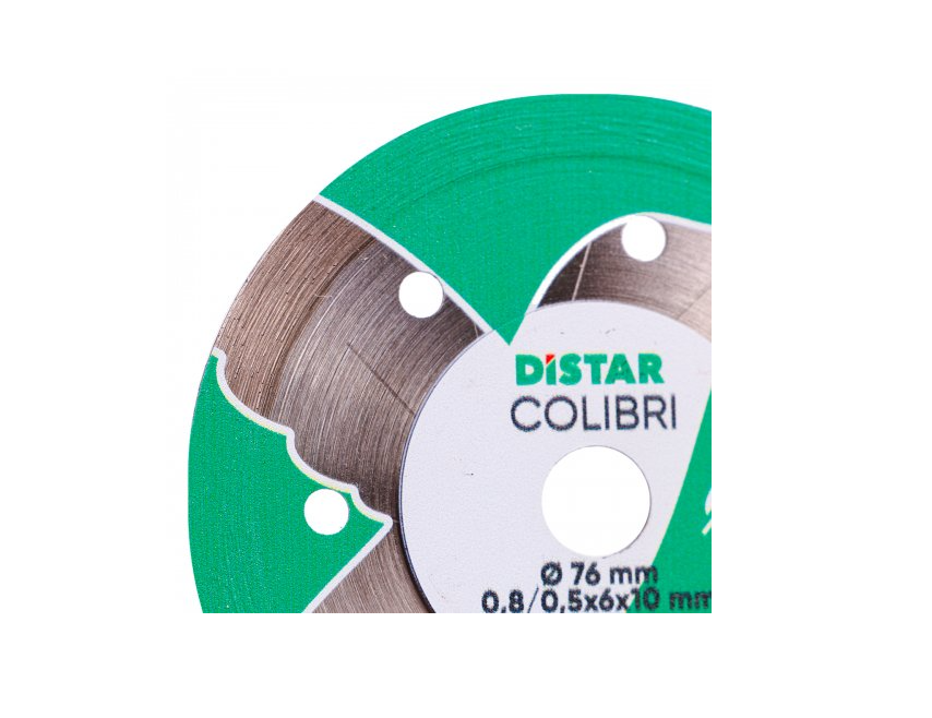 Круг алмазний Distar Colibri керамограніт 76x10x0.8 мм - професійний інструмент для точного і чистого різання кераміки та керамограніту. Завдяки компактному розміру за допомогою цього інструменту зручно вирізати люки в плитці, невеликі отвори, виконувати елементи декору тощо. Особливості алмазного диска Дістар Колібрі: Діаметр - 76 мм, товщина - 0,8 мм, діаметр посадкового отвору - 10 мм. Має суцільний алмазний шар, завдяки чому при різанні забезпечує ідеально чисті кромки, а товщина пропилу - мінімальна (до 1 мм). Призначений для сухого різання (без застосування води) Великий ресурс роботи і стабільна продуктивність. Підходить для роботи з кутовими шліфувальними машинами (болгарками). Країна-виробник: Україна.Переваги та гарантія