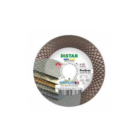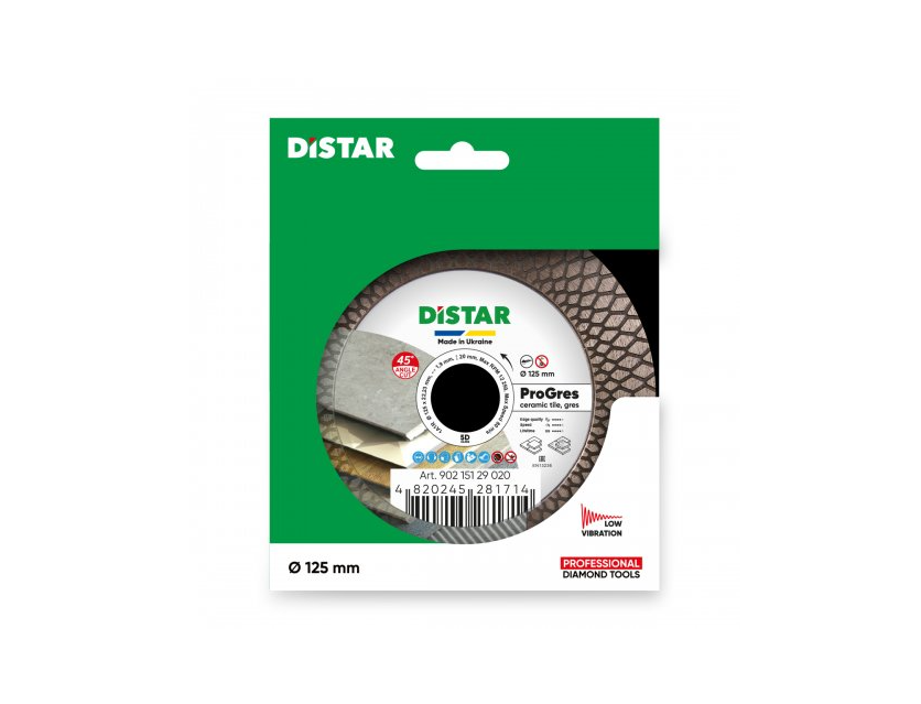 Круг алмазний відрізний DiStar CORONA 125x22.2 PRO Gres - поліфункціональний інструмент, який може виконувати відразу два завдання: різка та шліфування. Диск призначений для роботи з керамогранітом, керамічною плиткою. Діаметр даного алмазного круга Дістар становить 125 мм, посадкове місце - 22,2 мм. Все це дозволяє використовувати інструмент разом із популярними моделями болгарок (кутові шліфувальні машини). На лицьову сторону диска нанесений товстий алмазний шар 20 мм, він дозволяє ефективно шліфувати торці плитки, нерівні зрізи. Високу ефективність диск показує при виконанні різання під кутом 45 градусів, «заусовку». Під час відрізання плитки алмазний шар виконує шліфування зрізу, завдяки чому робота виглядає більш акуратно.Переваги та гарантія