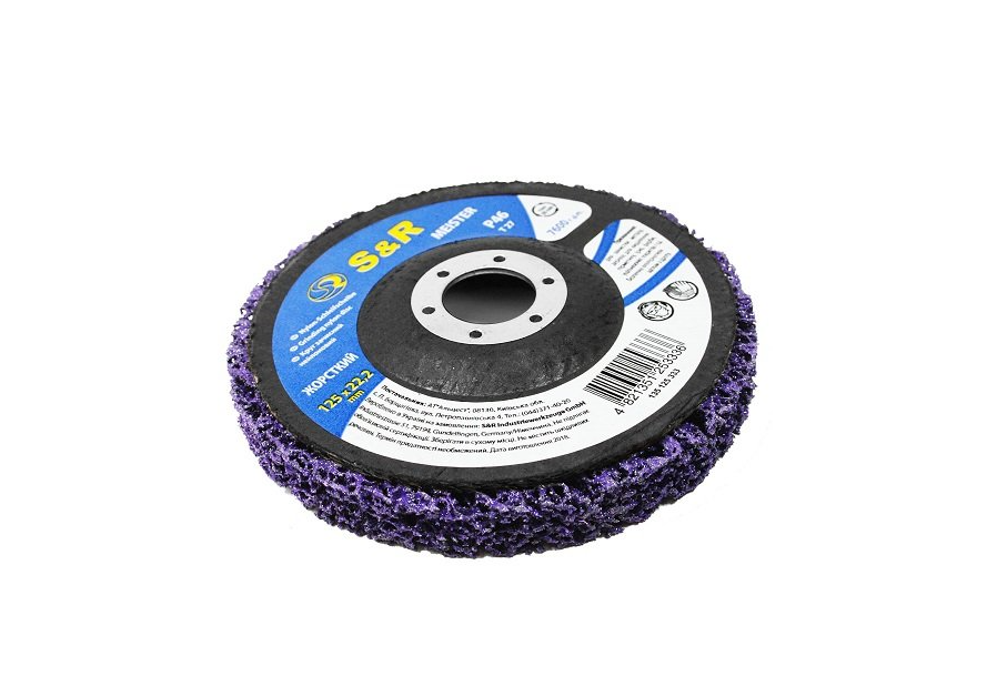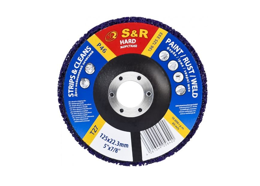 S&R 125x22.2 P46 фіолетовий - зачистний диск по металу та деревині, що забезпечує очищення поверхні від фарби, клею, іржі та інших покриттів. За допомогою кутової шліфувальної машини нейлоновий диск діаметром 125 мм забезпечує безпечне зняття і зачистку поверхні. Нейлонова основа кола більш гнучка і зручна для використання у важкодоступних місцях, для зачистки предметів. Завдяки своїй структурі практично не забивається, має довгий термін експлуатації. S&R 125x22.2 P46 жорсткий - надійний нейлоновий диск для зачистки металевих і дерев'яних поверхонь.Переваги та гарантія