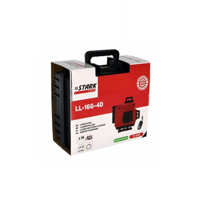 Нівелір лазерний STARK LL-16G-4D 16 ліній – інструмент професійного класу, що створює 16 ліній (вертикальних та горизонтальних). Колір ліній – зелений. Даний інструмент дозволяє позиціонувати предмети ідеально рівно в приміщенні. Може використовуватись під час проведення ремонтних, будівельних робіт, а також у побуті при позиціонуванні декорацій тощо. Особливості лазерного нівеліру Штарк LL-16G-4D: Дальність роботи інструменту – 30 м. Має високу точність - +-1,5 мм/5м. Самовирівнюваний: діапазон самовирівнювання +-3 °. Модель проєктує 16 ліній у режимі 4D на 360 °, є 8 точок перетинів. Можливість роздільного увімкнення лазерних променів. Дозволяє робити проєкцію під бажаним кутом. Оснащена лазерним діодом 532 нм/15 мВт. Наявність індикатора рівня площі зі звукоим сигналом. Функція блокування маятника з увімкненим діодом. Платформа нівеліру дозволяє регулювати висоту розташування інструменту. Поворотна база на 360 ° передбачає можливість кріплення до штативу. Завдяки наявності магніту та металевої плашки може також кріпитися до різних поверхонь. Працює від 2 літій-іонних акумуляторів (входять до комплекту поставки). Може використовуватися при температурі навколишнього середовища: від -10°С до +40°С. Має кріпильне різьблення 5/8х11, стандарт UNC. Управління здійснюється за допомогою пульта дистанційного керування. Допускається використання нівеліру в запилених та вологих приміщеннях, оскільки інструмент відповідає класу IP-54. Маса – 700 грамів. Комплектація: Акумулятори - 2 шт. База - 1 шт. Пластина для встановлення магнітного тримача - 1 шт. Магнітний тримач - 1 шт. Пульт дистанційного керування - 1 шт. Перехідник 1/4-5/8 - 1 шт. Тримач - 1 шт. Зарядний пристрій - 1 шт. Підставка для корегування висоти нівелювання - 1 шт. Кейс.Переваги та гарантія