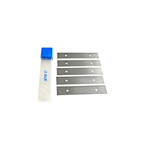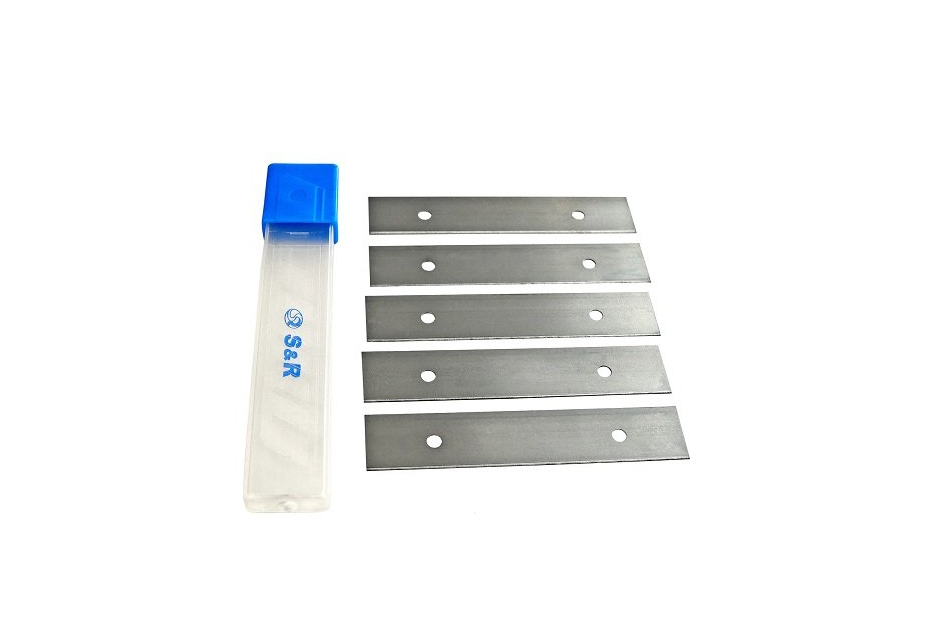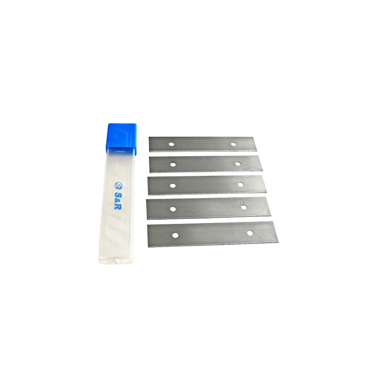 Леза S&R SK5 до телескопічного шкребка 5 шт. - набір змінного ріжучого інструменту, який використовується для видалення з рівних поверхонь крапель розчину, фарби, для різу будівельних матеріалів і т. ін. Представлені леза виготовлені з міцної сталі SK5, завдяки чому вони мають в два рази більший ресурс використання, аніж аналоги. Довжина лез 100 мм, що робить їх придатними для застосування разом з популярними шкребками телескопічними типу S & R 420-630 мм. У наборі поставляються 5 лез, їх покупка рекомендується для професійного використання.Переваги та гарантія