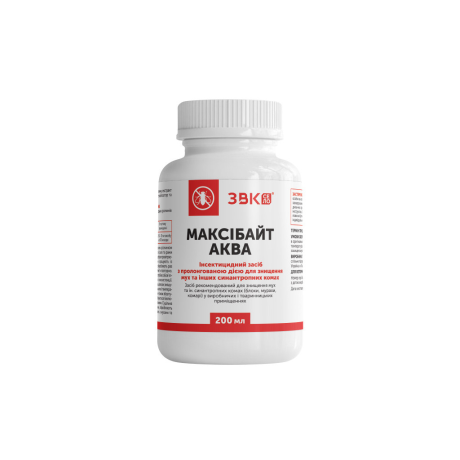 Засіб рекомендований для знищення мух та ін. синантропних комах (блохи, мурашки, комарі) у виробничих і тваринницьких приміщеннях. Інсектицидний засіб з пролонгованою дією для знищення мух та інших синантропних комах Засіб застосовують у вигляді водних розчинів у концентрації: В присутності тварин та птиці 1 % – 10 мл засобу на 990 мл води; В пустому приміщенні 2,5 % – 25 мл засобу на 975 мл води; В присутності тварин: Флакон 25 мл – на 2,5 л води, флакон 100 мл на 8-10 л. води. В пустому приміщенні: Флакон 25 мл – 975 мл води, флакон 100 мл на 3л 900 мл води. Для боротьби з комахами обробляють 1 % – 2,5% робочим розчином «Максібайт Аква» місця посадки комах (скло та рами вікон, дверні коробки тощо) у добре провітрюваних приміщеннях. Поверхні зрошують із відстані 20 – 40 см. Норма витрати робочого розчину Максібайт Аква складає 50 мл/м² у залежності від чисельності мух і типу поверхні, що підлягає обробці. При великій чисельності мух норму витрат робочого розчину можна збільшити до 100 мл/м². Поверхні обробляють раз на 5-7 днів, при потребі обробити повторно Перед застосуванням флакон потрібно обов’язково збовтати до однорідної консистенції. Робочий розчин засобу готують шляхом змішування концентрату з водою кімнатної температури ( +18°C – + 25 °C). Після чого робочий розчин також збовтують. Приготування розчину відбувається безпосередньо перед його застосуванням, постійно і рівномірно розмішуючи. Суцільна обробка приміщень заборонена, обробляють лише поверхні, які контактують з мухами та іншими комахами. До роботи допускаються особи не молодше 18 років, які не страждають захворюваннями крові, печінки, органів дихання, пройшли спеціальну підготовку та інструктаж. Не допускаються до роботи вагітні та жінки, які годують груддю, а також особи з хронічними захворюваннями та підвищеною чутливістю до хімічних сполук. Особи, які працюють із засобом, повинні бути забезпечені комплектом засобів індивідуального захисту. При виконанні всіх робіт із засобом «Максібайт Аква» необхідно суворо дотримуватися заходів безпеки та правил особистої гігієни, не курити, не пити, не вживати їжу. Особливо обережно слід працювати з концентрованим засобом.Переваги та гарантія