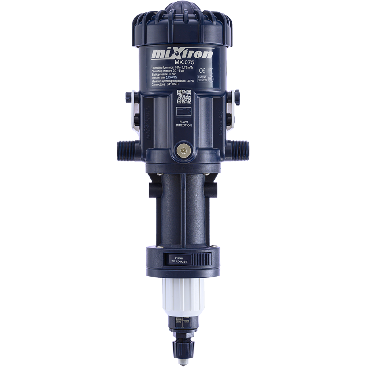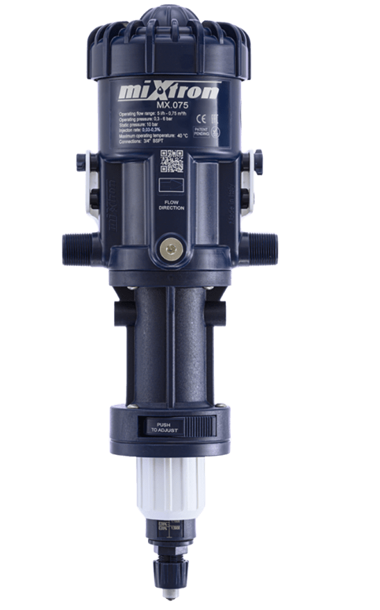 Mixtron MX.075.P003– це високоточний медикатор-дозатор, який працює виключно на водяному тиску (від 0,3 до 6 бар) і не потребує електроживлення. Його гнучке співвідношення дозування в діапазоні 0,03 - 0,3 %забезпечує ефективне змішування рідких препаратів із водою незалежно від витрати.