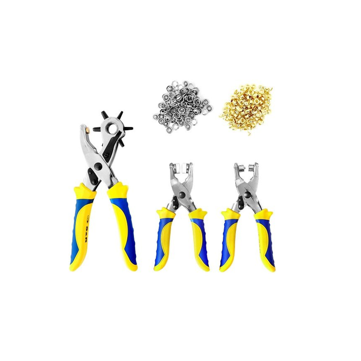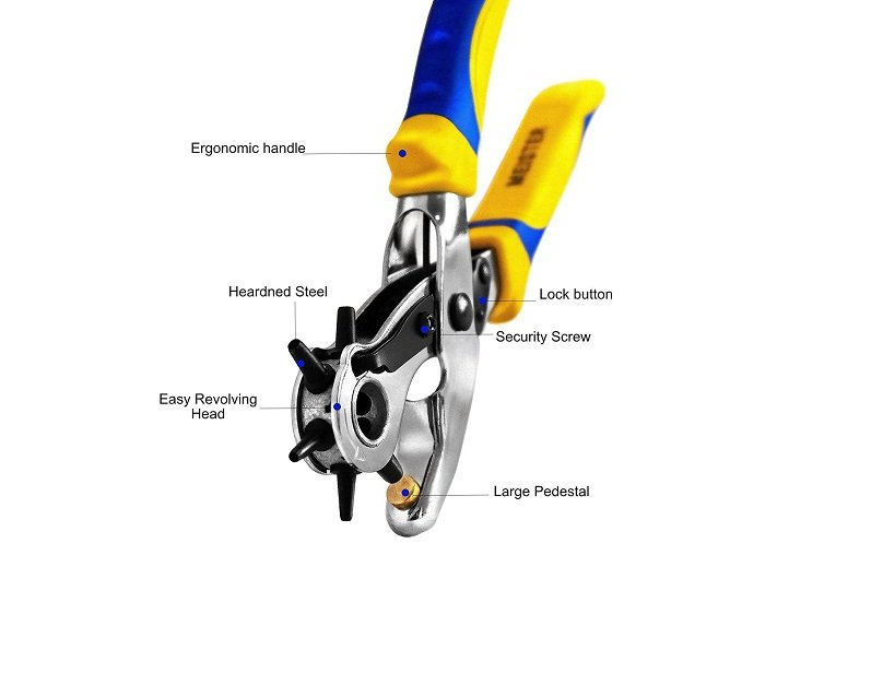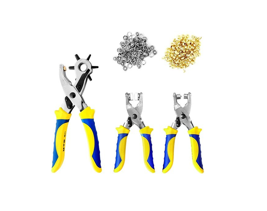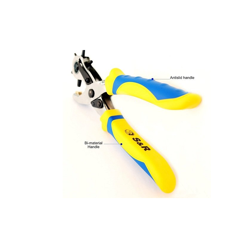 Набір S&R: дирокол + щипці 2 шт. - набір інструментів, які стануть у нагоді у швацькій, галантерейній справі. У комплект входять: Дирокол 225 мм для пробивання отворів у шкірі, тканини, картоні, пластику. Робочі діаметри дироколу наступні: 2; 2.5; 3; 3.5; 4; 4.5 мм. Щипці для встановлення люверсів (металевих кілець, що зміцнюють краї отвору у тканини 150 мм). Щипці для встановлення кнопок 150 мм на тканини. Набір кнопок 9 мм 25 шт. Набір люверсів 4 мм 100 шт. Переваги набору S & R для галантереї: Інструмент виготовлений із загартованої вуглецевої сталі, що гарантує його тривалий термін служби. Дирокол і щипці оснащені ергономічними антисклизькими руків'ями. На поворотній голівці дироколу є фіксатор для забезпечення максимально простої і точної роботи. Невеликі габарити інструменту дають можливість працювати з маленькими заготовками. Купити набір S & R: дирокол + щипці 2 шт. з аксесуарами рекомендується для любительського або професійного використання.Переваги та гарантія