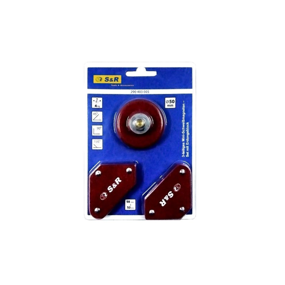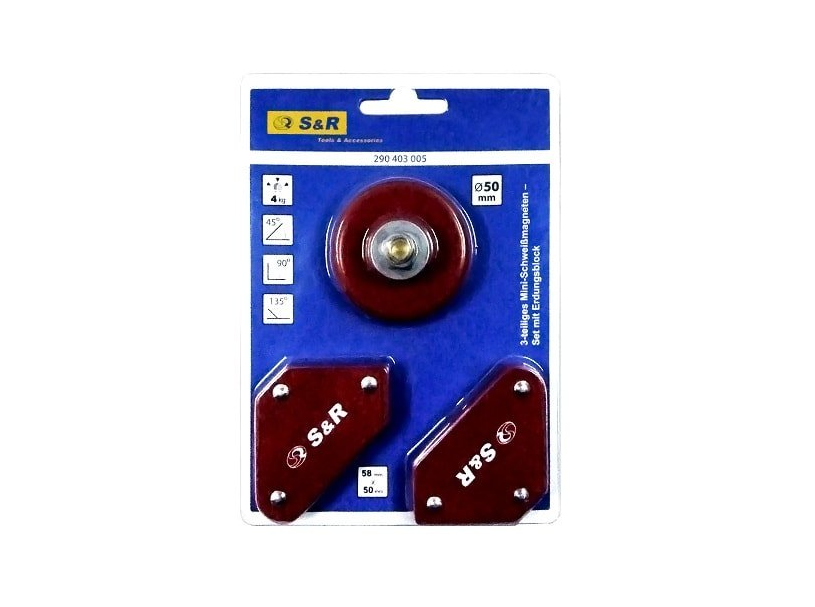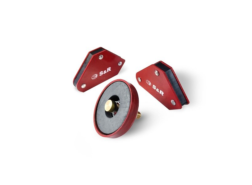 S & R 290403005 - міні магніти для виконання зварювальних робіт по металу. У комплекті йде 2 шт. невеликих магнітів розміром 5,8х5 см, а також маса заземлення. Завдяки набору магнітних власників конструкцію для зварювання легко зафіксувати з різних боків в потрібному положенні. Максимальна вага елементів 4 кг. Магнітні фіксатори мають кути 45 °, 90 °, 135 °, завдяки яким можна створити зварювальний шов під потрібним кутом. Маса заземлення діаметром 50 мм з максимальною силою струму 200А. Набір магнітних утримувачів S & R 290403005 дозволяє не тільки рівно зварювати між собою металеві елементи, але і звільняє руки для коригування положень, для утримання інструменту і ін.Переваги та гарантія