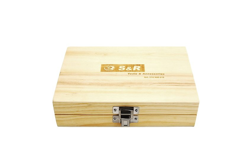 Набір фрез S&R для деревини 15шт. хв.8 мм - призначений для використання разом з фрезером. Включає 15 фрез різних форм і розмірів з діаметром хвостовика 8 мм. Вони виготовлені з твердої загартованої сталі з твердосплавними напайками YG8, завдяки чому легко ріжуть м'яку і середню по твердості деревину, фанеру, МДФ. Також в набір входить дерев'яний короб з металевою застібкою - для зберігання і транспортування ріжучого інструменту. У коробі є візуальна індикація під кожною фрезою у вигляді результату обробки деревини, завдяки ній користувач легко і швидко зможе знайти потрібний інструмент з набору. Купити набір фрез S&R для деревини 15шт. рекомендується для професійного або любительського використання.Переваги та гарантія