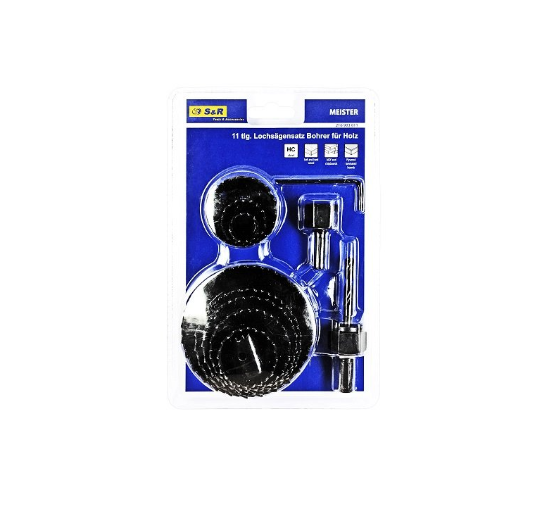 S & R Meister 19-82 мм - набір кільцевих пил для свердління отворів в деревині. Кільцева пила по дереву використовується як в меблевій промисловості, так і в ремонті, і будівництві. Призначені для роботи дрилем або свердлильними установками. У набір входять 11 предметів: державка - 2 шт .; кільцева пила - 19 мм; кільцева пила - 22 мм; кільцева пила - 29 мм; кільцева пила - 38 мм; кільцева пила - 44 мм; кільцева пила - 51 мм; кільцева пила - 60 мм; кільцева пила - 67 мм; кільцева пила - 82 мм. Кільцева пила виготовлена і високовуглецевої сталі, завдяки чому має високу міцність і зносостійкість. Острозаточенного зуби з легкістю прорізають деревину, а також всі деревосодержащіх матеріали: гіпсокартон, фанера, ДСП, ДВП, МДФ. Цілісність коронки забезпечують отвору рівні краї.Переваги та гарантія