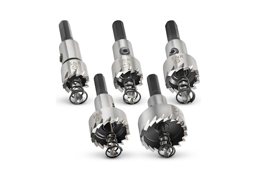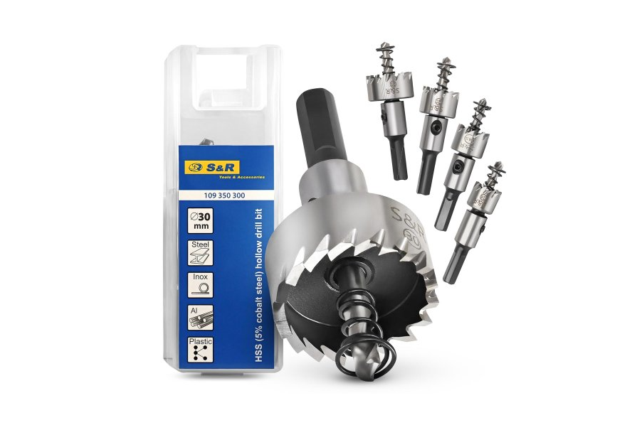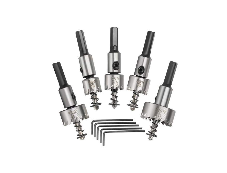 Набір коронок по металу S&R Meister Meister HSS M35 Co5% (у зборі) 5 шт - містить корончасті свердла таких діаметрів 16/18,5/20/25/30 мм. Коронки S&R, які входять до набору, призначені для свердління отворів у чорному металі, нержавіючій сталі, кольорових металах за допомогою дриля або свердлильних установок. Кожна коронка виготовлена зі швидкорізальної HSS сталі марки M35, до складу якої входить кобальт - 5%. Завдяки міцній сталі коронка має довгий термін служби, а також дає змогу просвердлювати отвори в нержавіючій і нелегованій сталі до 2 мм у глибину, а в кольоровому металі до 4 мм (загальна висота коронки - 15 мм). Діаметр хвостовика - 9,5 мм. Кількість зубів на дюйм - 4/6 tpi. У комплекті з кожною коронкою по металу S&R входить центрувальне свердло з пружиною, завдяки якому коронкою можна виконати точні та рівні отвори в металі. У комплекті також йде шестигранний L-подібний ключ для легкого складання та встановлення коронки. Коронки по металу S&R Meister HSS M35 Co5% - міцні, довговічні інструменти для дриля та свердлильних верстатів, що виконають швидке свердління у твердих і м'яких металах з високою точністю.Переваги та гарантія