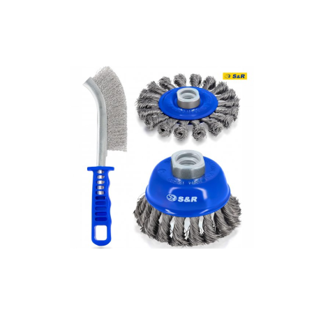 Характеристики Набір щіток 3 шт: ручна 255мм; чашкова 75мм x M14; дискова 100мм x M14; плетений дріт S&R (135003003)