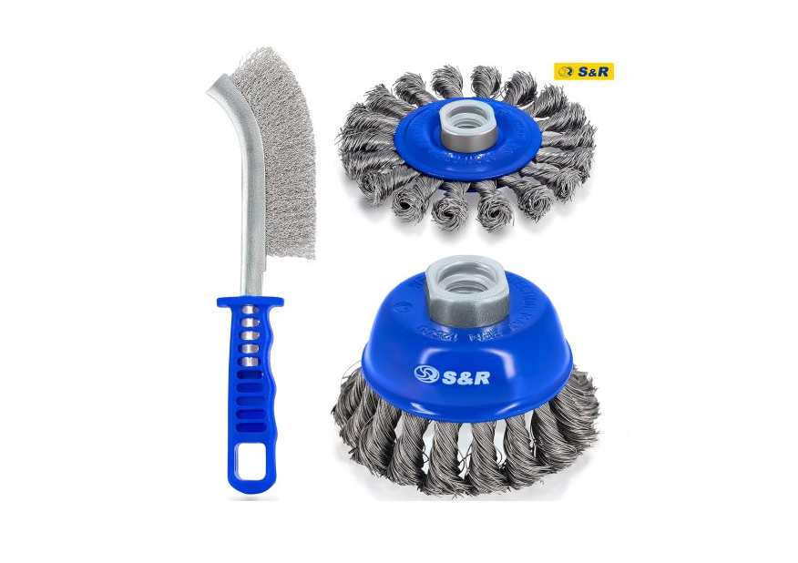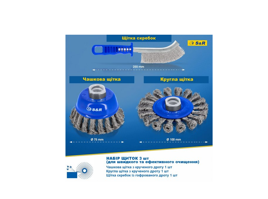 Запитання Набір щіток 3 шт: ручна 255мм; чашкова 75мм x M14; дискова 100мм x M14; плетений дріт S&R (135003003)