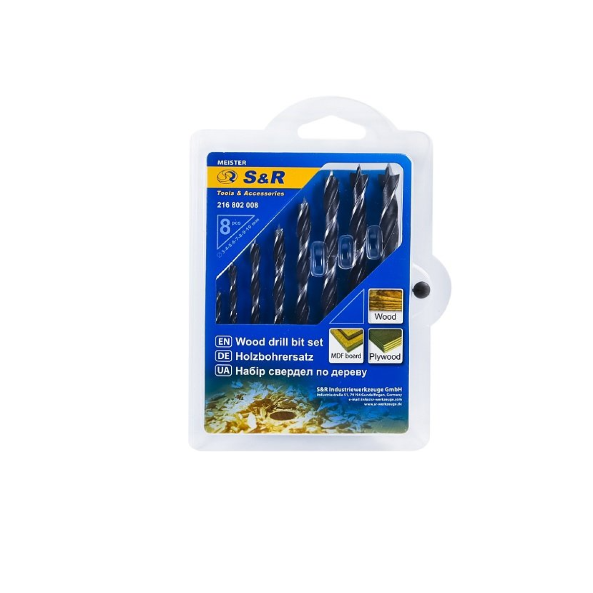 Набір свердел S&R Meister по дереву 8 шт. 3-10 мм - призначений для свердління заготовок з дерева, МДФ, фанери. У набір включені 8 свердел діаметром: 3, 4, 5, 6, 7, 8, 9, 10 мм. Кожне свердло виготовлено з якісної сталі, оброблено від корозії. Набір поставляється в блістерній упаковці. Підходить для роботи з популярними моделями дрилів. Купівля набору свердел по дереву S&R Meister рекомендується для любительської або професійної роботи.Переваги та гарантія