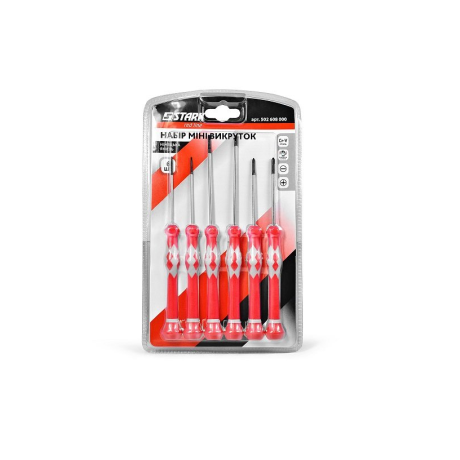 Stark 6 шт. - набір викруток для роботи з закручування відкручування дрібних кріпильних елементів, для роботи з електронікою. Виготовлені з хром-ванадієвої сталі, яка забезпечує зносостійкість інструменту. Володіє твердістю, що запобігає стиранню жала, а також захищені від корозії. Рукоятки і жало не проводять статичної електрики, що не намагнічуються, що дозволяє працювати інструментом з електроприладами та іншої електронікою. Набір викруток Stark складається з 6 предметів: Викрутка SL 2x60 мм 0,3х1,8 - довжина жала - 60 мм; діаметр жала - 2, розмір робочої частини - 0,3х1,8 мм. Викрутка SL 2x60 мм 0,4х2,0 - довжина жала - 60 мм; діаметр жала - 2, розмір робочої частини - 0,4х2,0 мм. Викрутка SL 3x80 мм 0,5х3,0 - довжина жала - 80 мм; діаметр жала - 3, розмір робочої частини - 0,5х3,0 мм. Викрутка SL 3x80 мм 0,4х2,5 - довжина жала - 80 мм; діаметр жала - 3, розмір робочої частини - 0,4х2,5 мм. Викрутка PH0 х 60 мм 3 мм - довжина жала - 60 мм, діаметр жала - 3 мм, підходить для роботи з шурупами менше 2 мм; Викрутка PH00 х 60 мм 3 мм - довжина жала - 60 мм, діаметр жала - 3 мм, використовується з дуже маленькими шурупами. Stark 6 шт. - набір компактних викруток для розбирання та збирання предметів з дрібними шурупами, під які звичайні викрутки не підходять.Переваги та гарантія
