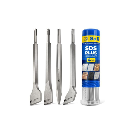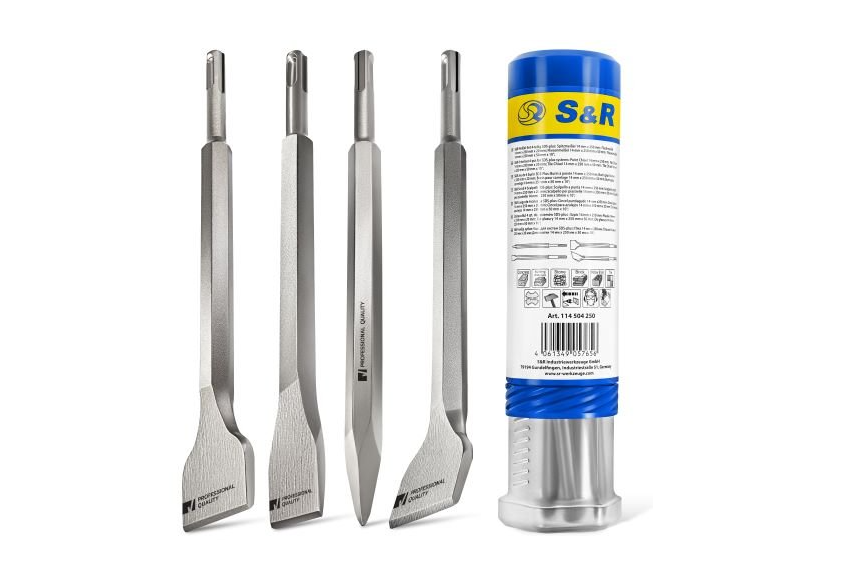 Набір зубил S&R Meister sds-plus 4 шт - включає 4 інструменти для роботи з перфоратором: Пікоподібне зубило 14х250 мм - 1 шт; Плоске зубило 20х250 мм - 1 шт; Плоске зубило для плитки 580х250 мм - 1 шт; Плоске вигнуте під 10° зубило для плитки 50х250 мм -1 шт. Особливості набору зубил S&R Meister sds-plus 4 шт: Інструмент виконаний із загартованої інструментальної сталі. Підходить для роботи з бетоном, каменем, цеглою, плиткою. Довжина зубил із набору - 250 мм; робоча довжина - 190 мм. Корпус - шестигранний, діаметром 14 мм. Хвостовик - SDS-plus. Поставляється у зручному пластиковому тубусі з гвинтовою кришкою. Маса - 1,308 кг. Країна-виробник: Китай. Країна бренду: Німеччина.Переваги та гарантія