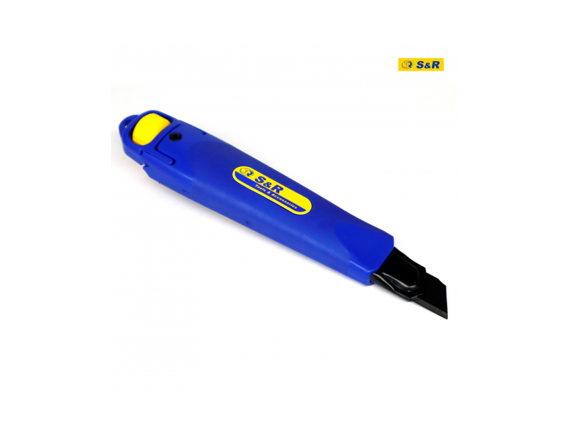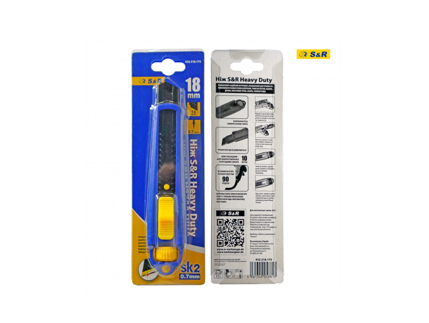 S&R HEAVY DUTY 18 мм – компактний ніж для виконання будівельних та ремонтних робіт, дозволяє різати різноманітні матеріали: гумові, картонні, тканинні, пластикові та ін. Особливості ножа S&R HEAVY DUTY 18 мм: Завдяки невеликим розмірам ножем легко працювати у важкодоступних місцях, він не займає багато місця в інструментальній валізі. Лезо виготовлене з якісної сталі, легко висувається, фіксується за допомогою спеціального гвинтового фіксатора. Корпус виконаний із легкого та міцного ABS пластику з гумовими вставками для комфортної роботи. Захист на випадок падіння: навіть при падінні з висоти 10 м ніж СР не втрачає своїх властивостей. Оснащується лезом шириною 18 мм, довжиною 100 мм та товщиною 0,7 мм. Маса - 0,134 кг. Країна бренду: Німеччина. Країна-виробник: Китай.Переваги та гарантія