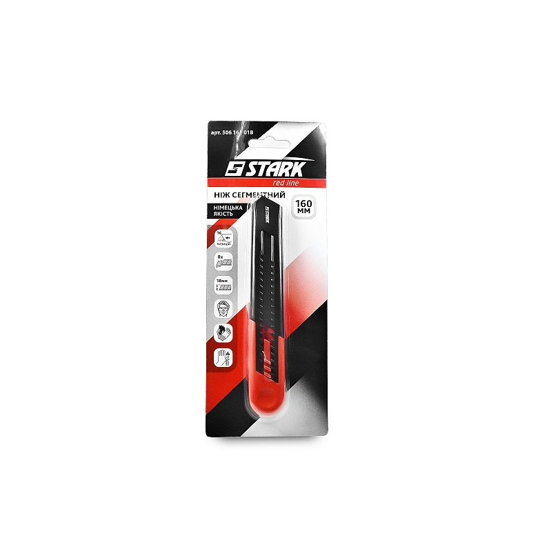 Stark 160 мм - сегментний ніж для виконання будівельних і ремонтних робіт, дозволяє різати різного роду матеріали: гумові, картонні, матерчаті, пластикові та ін. Лезо виготовлено з якісної високовуглецевої сталі легко висувається і автоматично фіксується. Лезо має 16 позицій. Легко рухається, не ламається при натисканні, довгий час качестенно ріже НЕ затуплена. Ніж в пластиковому корпусі.Переваги та гарантія