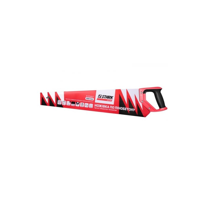 Ножівка Stark 600 мм по пінобетону - інструмент для пиляння пінобетону. Відрізняється міцним полотном із високою стійкістю до зношування і прогумованою ергономічною рукояткою. Інші особливості ножовки по пінобетону Штарк 600 мм: Інструмент має полотно довжиною 600 мм, що дає змогу працювати з великими блоками. Виготовлено полотно з міцної висококарбонової сталі 65 HCS, стійкої до деформації. Товщина полотна - 1,4 мм, що сприяє тривалому терміну служби. Зуби - виконані із твердої загартованої сталі. Наявність у полотні отвору для підвішування на гачку. Маса інструменту - 0,702 кг.Переваги та гарантія