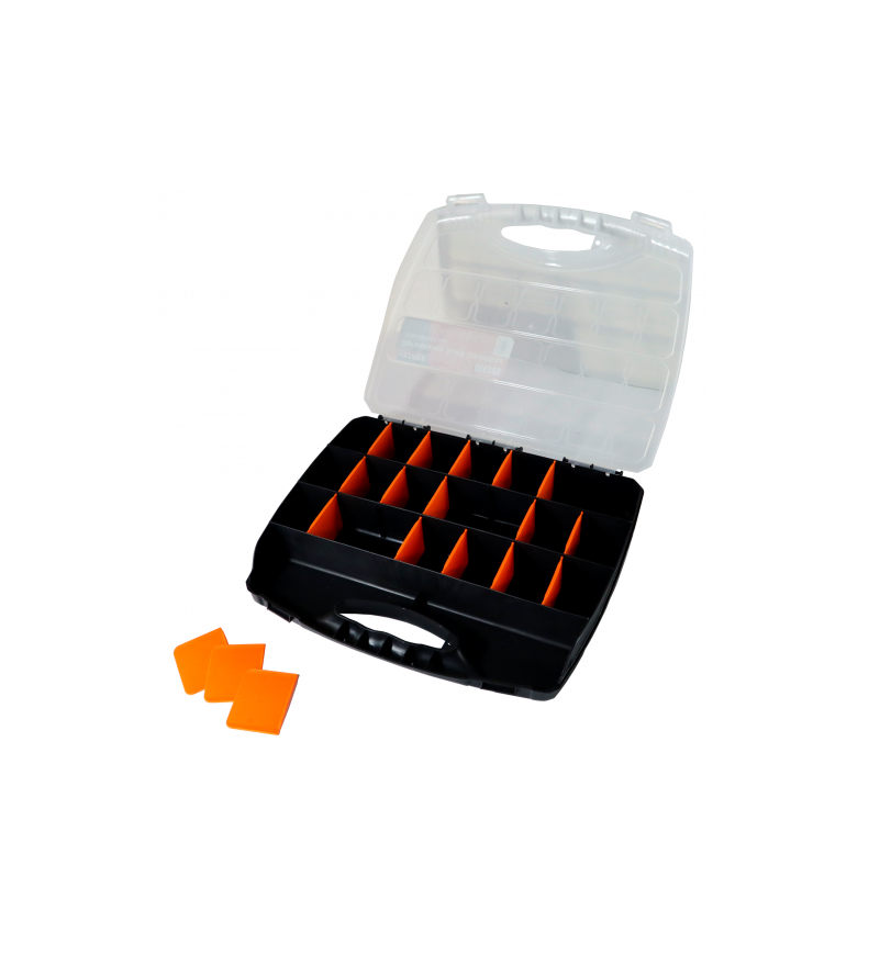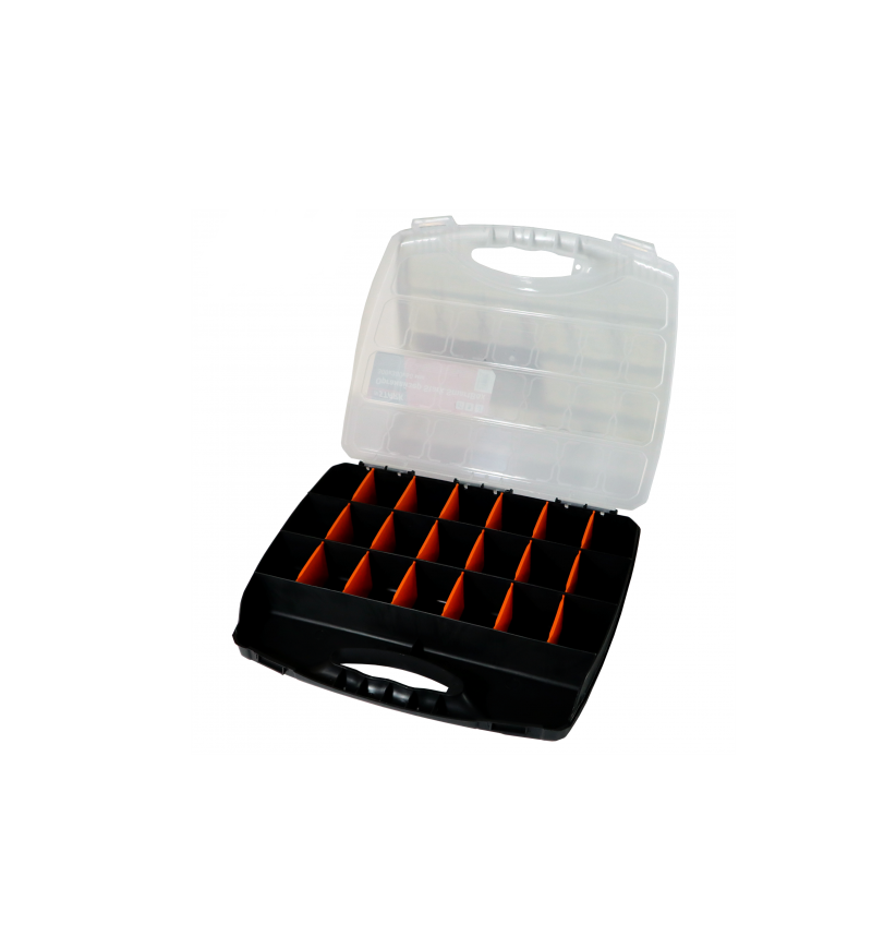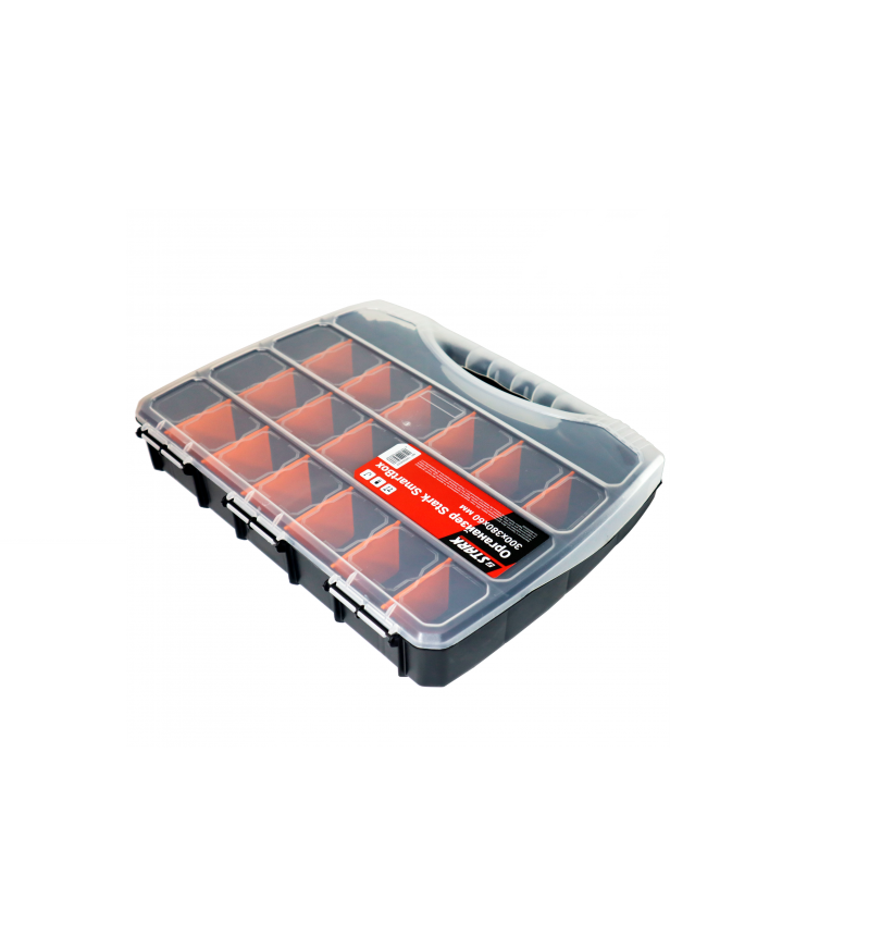Органайзер Stark SmartBox 300x380x60 мм дозволить організувати зберігання дрібних інструментів, кріплень, інших невеликих предметів. При використанні дозволить швидко знаходити потрібний інструмент, що значно прискорить виконання робіт. Основні переваги органайзера Stark SmartBox 100003033: Виготовлений із міцного пластику, що забезпечить тривалий термін служби. Прозора кришка дозволить користувачеві швидко визначити тип вмісту в органайзері. Надійні клямки запобігають мимовільному відкриттю органайзера. Модель має 22 невеликих відділеня, які користувач може об'єднувати між собою як завгодно - шляхом вилучення перегородки, що розділяє. Зручна ручка для транспортування органайзера. Маса – 684 грами.Переваги та гарантія