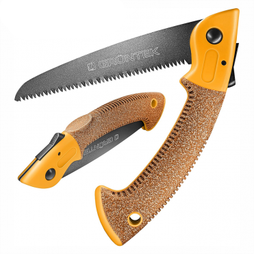 Gruntek Hai 180 мм. - розкладна ручна пила для роботи в саду. Зручний інструмент, не займає багато місця, оскільки в складеному вигляді довжина пилки всього 225 мм. Комфортна рукоятка з ребристою поверхнею не ковзає в руках. Якісне хромоване лезо, яке виготовлено з карбонової загартованої сталі 65MN. Безпечна пила, завдяки надійному фіксатора в складеному і розкладеному вигляді інструменту!Переваги та гарантія
