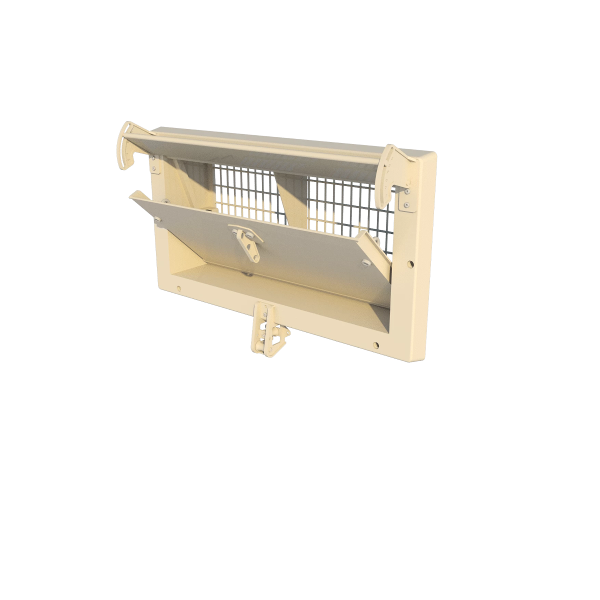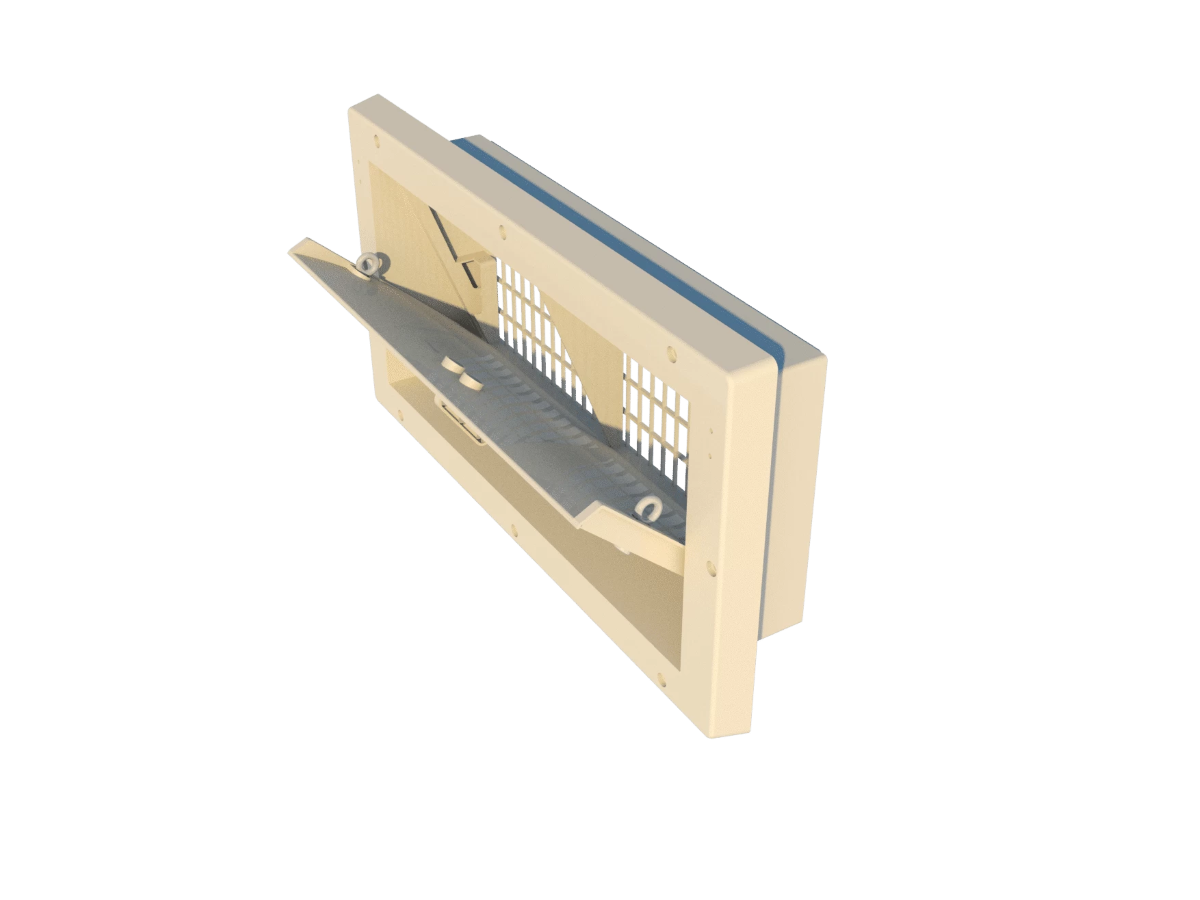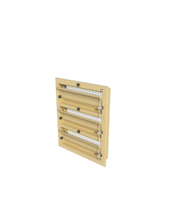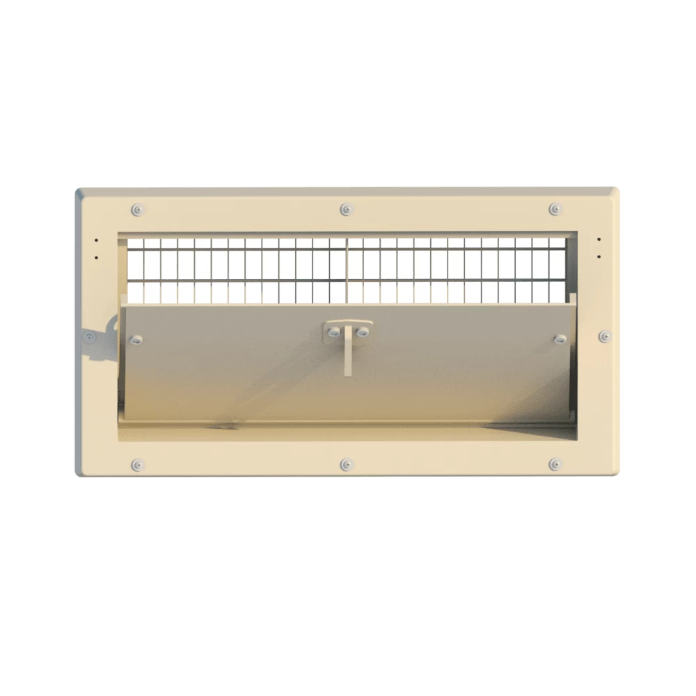 Настінна модель, фланець спереду, пряма внутрішня заслінка (ізольована). Керується за допомогою центрального пластикового важеля. Виготовлено з УФ-стабілізованого ABS-пластику. Включає дротяну сітку з замком. Нормально закрита версія з пружинами з нержавіючої сталі. Монтажні розміри 680*330 мм, ефективна глибина 110 мм. Продуктивність 1800 м3/год при 10 Па.Переваги та гарантія