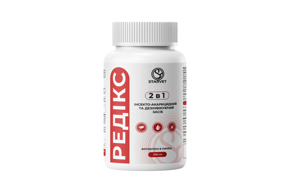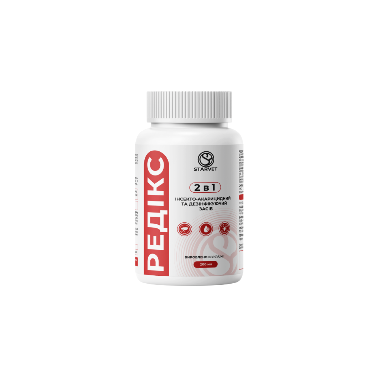 «РЕДІКС» 2 в 1 ІНСЕКТО-АКАРИЦИДНИЙ ТА ДЕЗІНФІКУЮЧИЙ ЗАСІБ. РЕДІКС — високоефективний інсекто-акарицидний та дезінфікуючий засіб, що чинить пряму контактну дію проти червоного пташиного кліща (Dermanyssus gallinae) на всіх стадіях розвитку. Знищує також інших ектопаразитів, зокрема мух (Musca domestica) та чорного жука (Alphitobius diaperinus). Препарат забезпечує комплексну дезінфекцію тваринницьких приміщень, ефективно інактивуючи широкий спектр збудників бактеріальних (E. coli, Salmonella spp., Staphylococcus aureus), грибкових (Candida spp., Aspergillus spp.) та вірусних інфекцій (включаючи віруси пташиного грипу, Ньюкасла, Марека, PRRSV, PCV-2, ІРТ ВРХ тощо).Переваги та гарантія