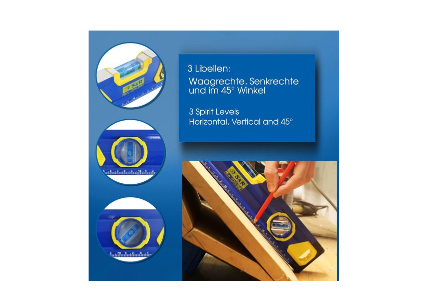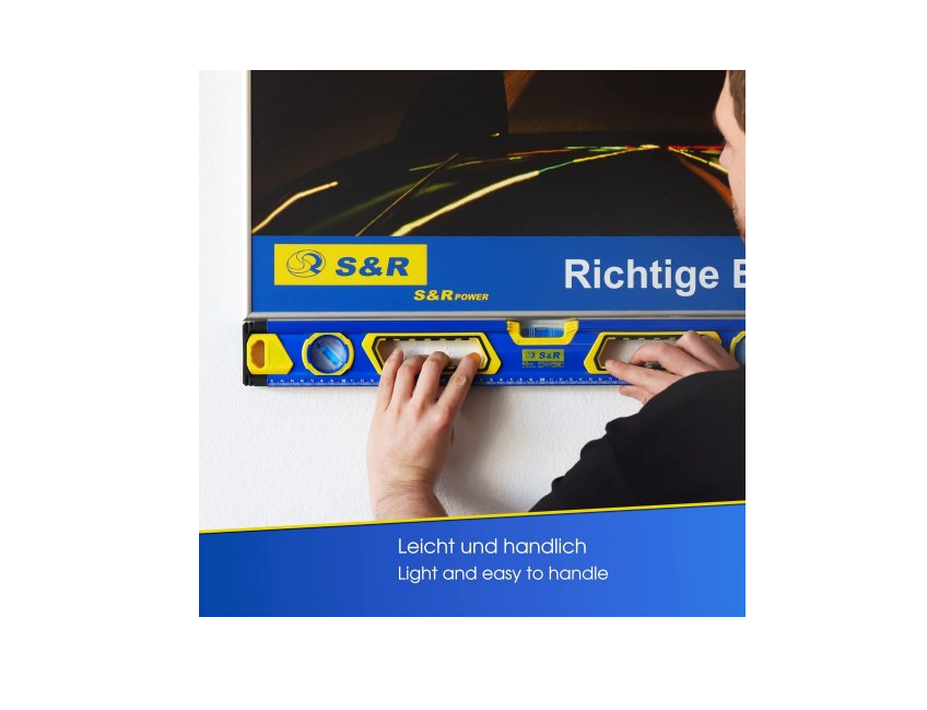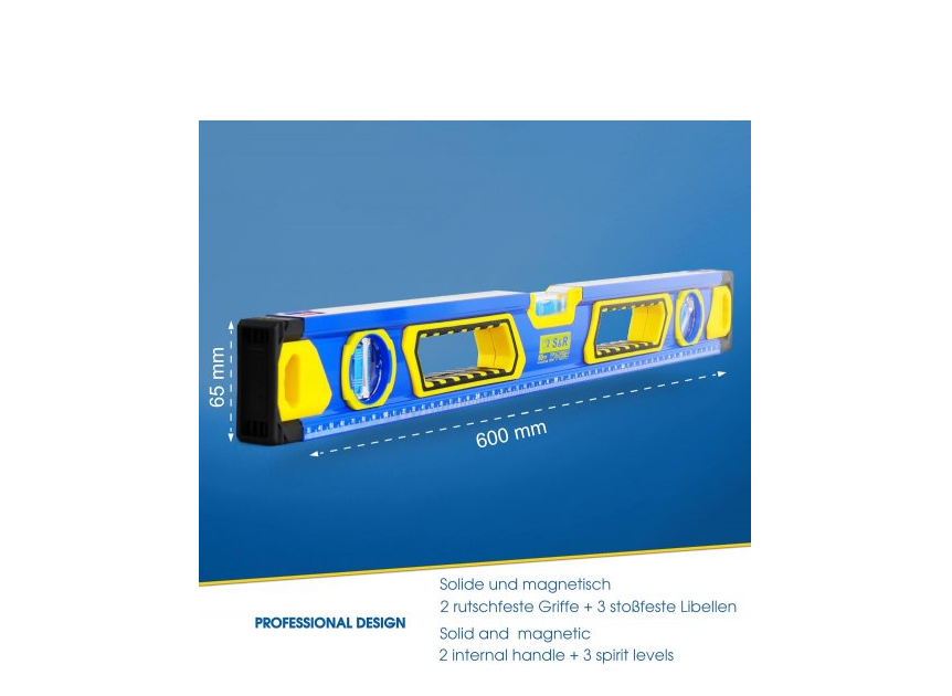 Рівень магнітний S&R 600 мм – дозволяє позиціонувати ідеально рівно предмети, виконувати розмітку тощо. Призначений для широкого застосування: у будівництві, при виконанні ремонтних робіт, у побуті (при встановленні побутової техніки, наприклад), у майстернях при виготовленні деталей конструкцій і т.д. Особливості бульбашкового рівня СР 60 см: Корпус виконаний із міцного та легкого алюмінію товщиною 1,3 мм. Довжина рівня – 60 см. Точна метрична шкала – виконання вимірювань. Має 3 вимірювальні капсули для виставлення за рівнем вертикально, горизонтально та під кутом 45°. Капсули виготовлені з удароміцного ABS-пластику. 2 магнітні сторони спрощують процес вимірювання/позиціонування металевих поверхонь, також вони дозволяють зручно зберігати рівень, прикріпивши його, наприклад, до металевих панелей, профілів, опор. Належить до класу точності 1, можливі відхилення в точності всього – 0,5 мм/м. На кінцях рівня встановлені ковпачки спеціальної форми із PVC пластику – для захисту інструменту від пошкоджень у разі падінь. 2 отвори-ручки із пластиковими накладками спрощують процес використання рівня. Габарити: 600х66х27 мм. Маса – 628 грамів. Країна-виробник: Китай. Країна бренду: Німеччина. Гарантія – 14 днів. Термін використання – не обмежений.Переваги та гарантія