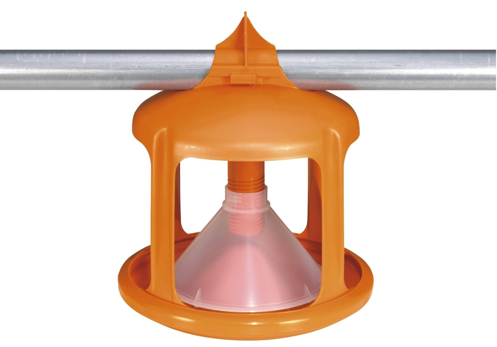 Кормушка интегрируется в автоматизированную систему подачи корма Augermatic. Корм транспортируется по трубе диаметром 45 мм и равномерно распределяется в тарелке кормушки. Специальная решетка предотвращает попадание птицы внутрь, уменьшая рассыпание корма и поддерживая гигиену.
