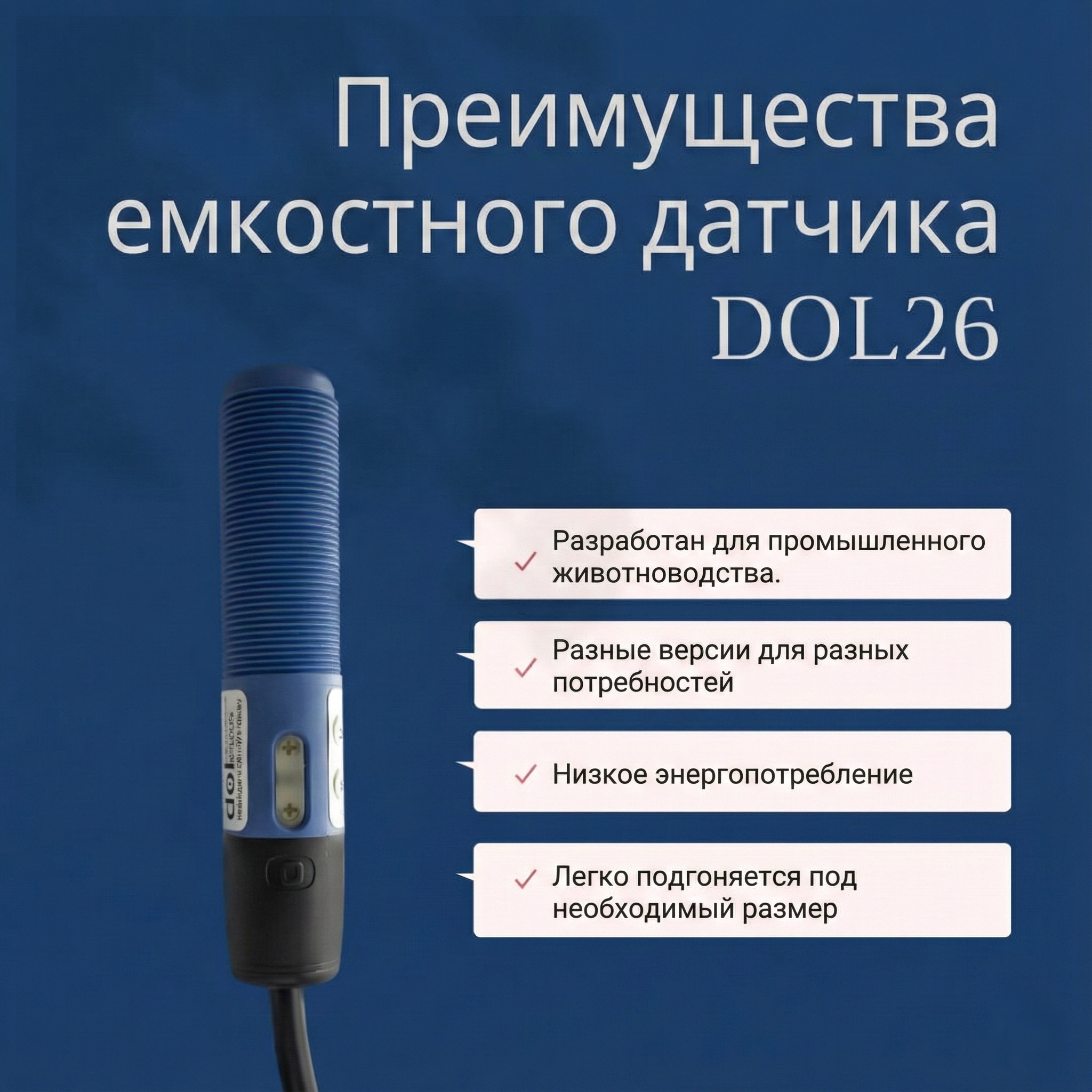 Датчик уровня корма DOL 26 – это небольшой емкостный датчик, который подходит для кормушек. Благодаря механической конструкции DOL 26 идеально подходит для использования в небольших системах с ограниченным пространством, например в кормушках на птицефабриках. Таким образом, датчик находится вне зоны досягаемости животных.Преимущества и гарантия