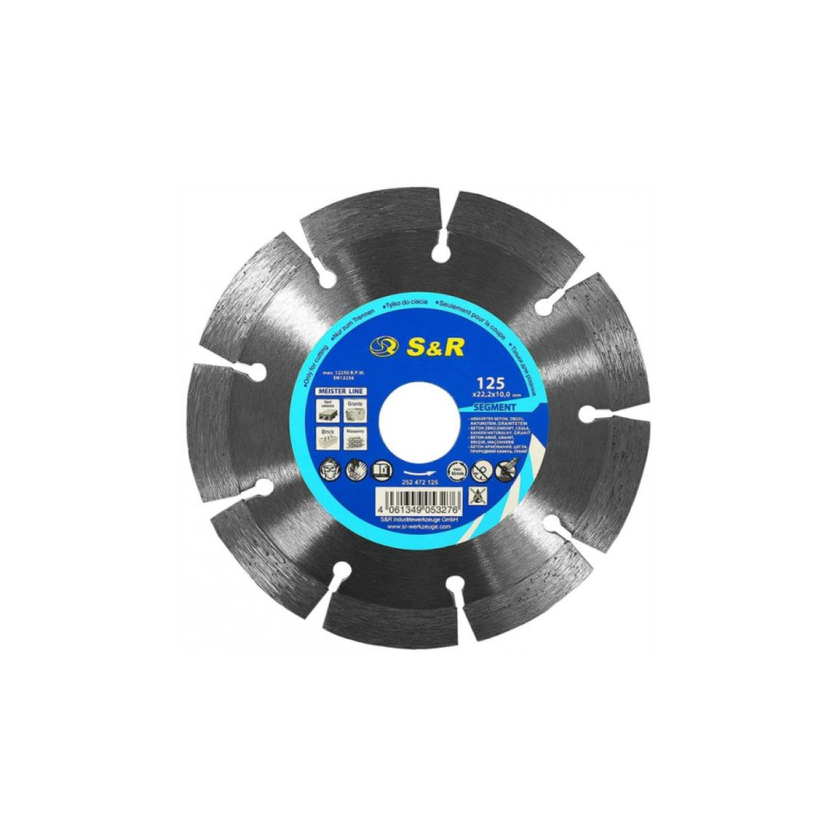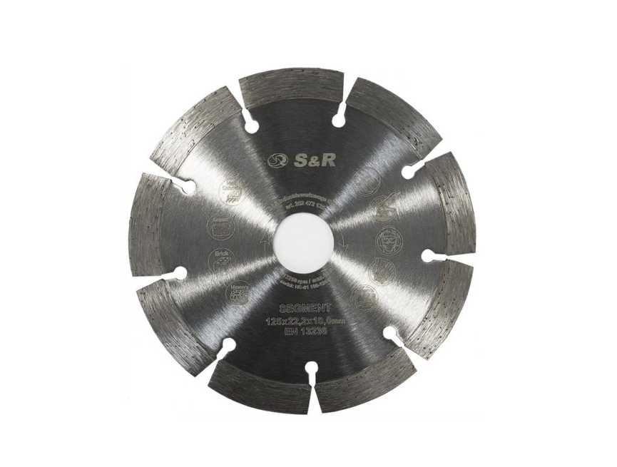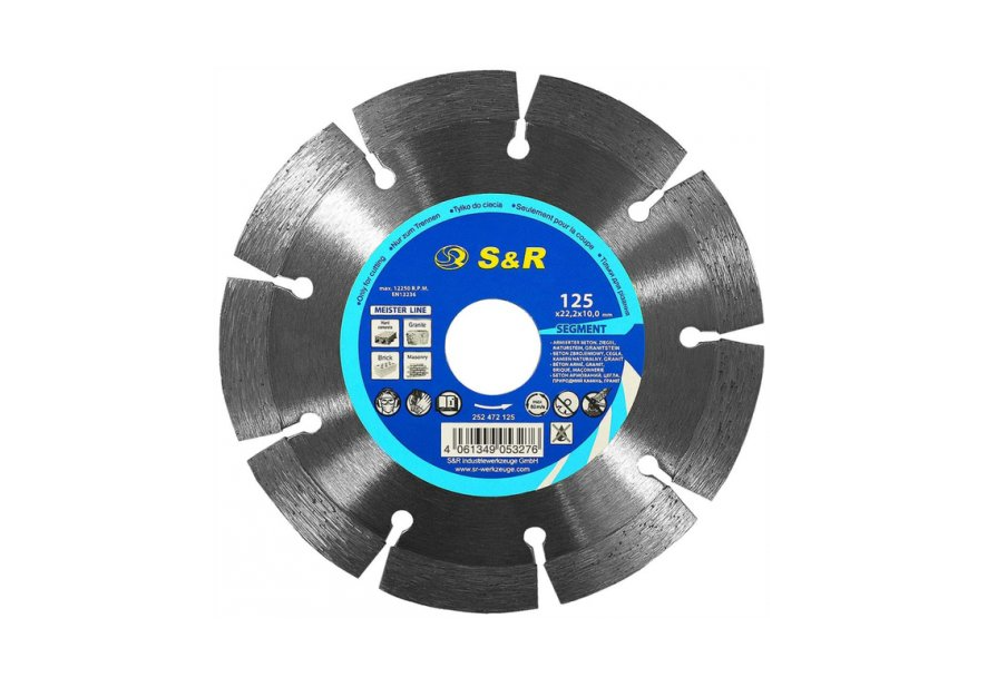 S&R Meister 125x22,2 – диск алмазный для резки армированного бетона, натурального камня, в том числе гранита. Предназначен для работы с угловыми шлифмашинами и бороздоделами, используются как с мокрым, так и с сухим резом. Оборудованный 9 сегментами с высотой 7 мм, за счет сегментов диск меньше нагревается и работает длительное время. S&R Meister 125x22,2 – универсальный сегментный диск для резки твердых материалов с длительным сроком службы.Преимущества и гарантия