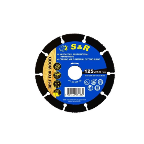 Диск S&R карбид-вольфрамовый 125 x 22.23 мм MULTI-MATERIAL - инструмент для резки дерева, пластика, гипсокартона, ламината. Предназначен для работы с популярными типами угловых шлифмашин, поскольку имеет диаметр 125 мм и размер отверстия: 22,2 мм. Диск изготовлен из металла с добавлением зерен карбид-вольфрама, что делает его износостойким, позволяет с его помощью быстро распылять заготовки. Для данной модели максимально допустимая скорость работы составляет – 12500 об./мин. Купить диск карбид-вольфрамовый S&R рекомендуется для профессионального использования.Преимущества и гарантия