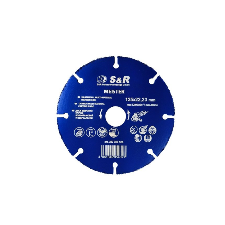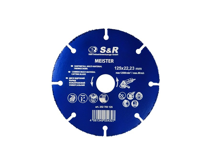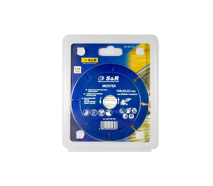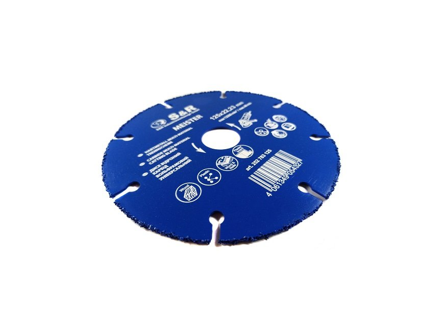 S&R 125x22.2 мм карбид-вольфрам – универсальный отрезной диск, который благодаря своим конструктивным особенностям легко режет такие материалы как: пластик, ламинат, ДСП, МДФ, фанера, деревянные заготовки, материалы с остатками цемента, с гвоздями и т.д. Диск S&R 125x22.2 мм изготовлен из металла по краям с крошкой твердосплавных зерен из карбид-вольфрама, обеспечивающих качественную работу с разными материалами. Благодаря сегментам диска можно дольше работать без перерыва на охлаждение. Диск S&R 125x22.2 мм карбид-вольфрам предназначен для работы с небольшими угловыми шлифмашинами.Преимущества и гарантия