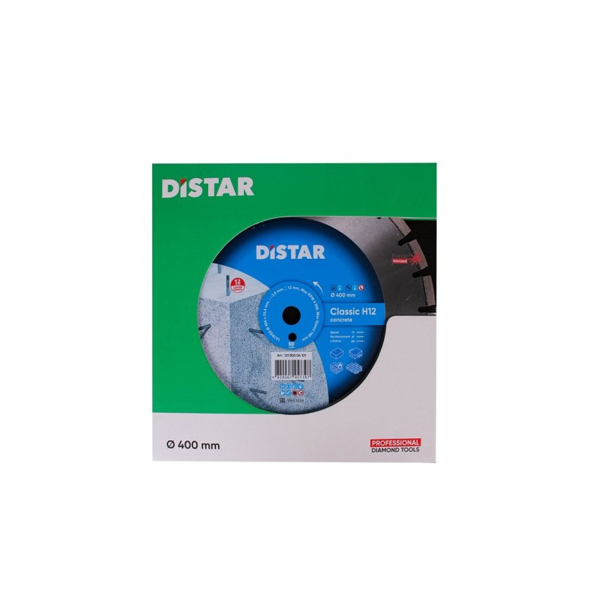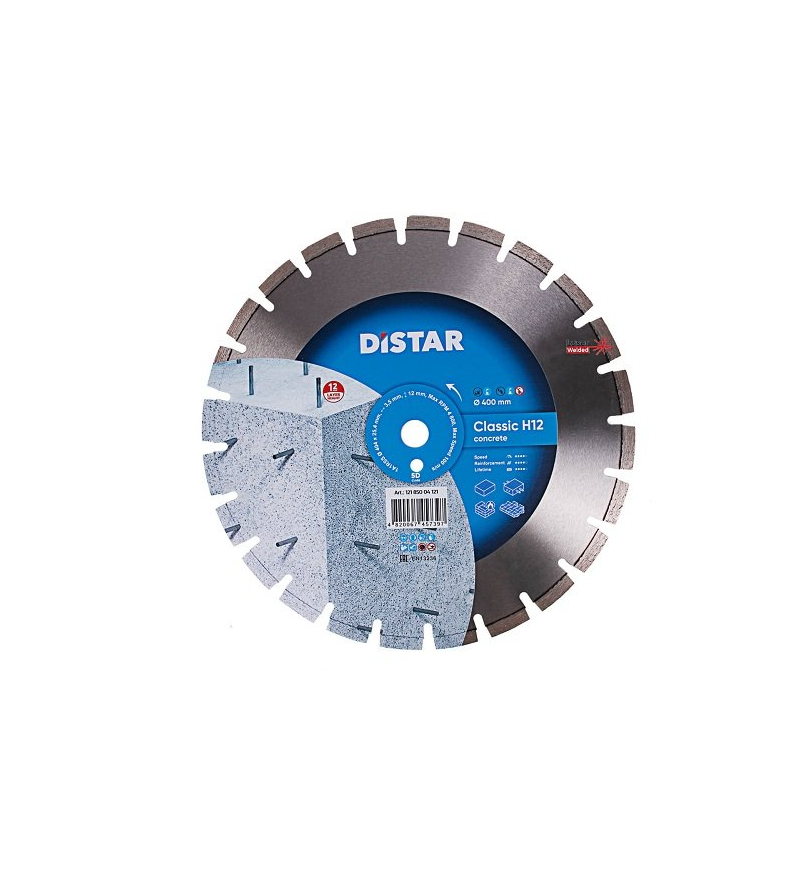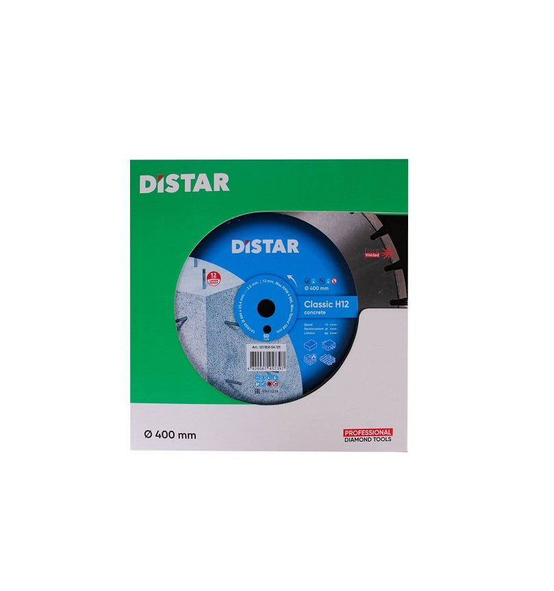Круг алмазный Distar Classic H12 5D 1A1RSS 404 мм бетон – диск для использования вместе с бензорезами и швонарезчиками малой и средней мощности 4-9 кВт. Предназначен для резки слабо армированного бетона, неармированного бетона, огнеупорного кирпича, кирпича. Основные преимущества алмазного круга Дистар Classic H12 5D 1A1RSS 404 мм по бетону: Диаметр диска – 400 мм; Посадочное отверстие 25,4 – F4; Подходит для сухой и мокрой резки с применением охлаждения; Толщина диска – 3,8 мм; Широкий алмазный слой – 12 мм; Высокая скорость резки – до 2,25 погонных метров в минуту или до 4800 оборотов в минуту. Относится к классу - 5D. Длительный ресурс работы: - при использовании с бензорезами до 400 м при скорости 1,5 м/мин; при использовании со швонарезчиками – до 500 м при скорости резки 2,25 м/мин. *Эта версия диска доступна и в других диаметрах.Преимущества и гарантия