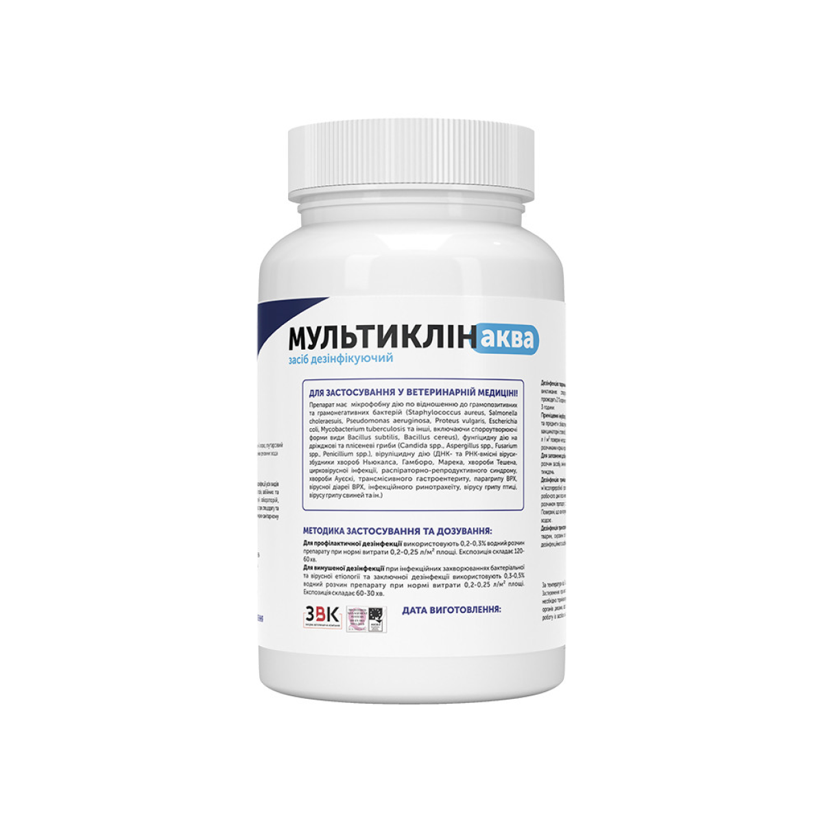 Препарат обладает бактерицидным, фунгицидным и вируцидным действием, используется для ручной и машинной мойки, заполнения дезбарьеров и дезковриков, дезинфекции транспорта и помещений, санации помещений в присутствии животных. Сохраняет свою активность при интенсивном свете, при использовании жесткой воды, в присутствии органических материалов (остатки корма, выделения животных и др.). Мультиклин Аква – комплексное моечно-дезинфицирующее средство с широким спектром действия: бактерицидное по отношению к грамположительным и грамотрицательным бактериям, в том числе эффективное для спорообразующих форм микроорганизмов: (Mycobacterium bovis, Mycobacterium fortuitum, Mycobacterium Bacillus cereus), Staphylococcus aureus, Streptococcus faecalis, Salmonella choleraesuis, Salmonella typhymurium, Pseudomonas aeruginosa, Escherichia соли, Klebsiella pneumonia, Proteus vulgaris); фунгицидной в отношении дрожжевых и плесневых грибов (Candida spp., Aspergillus spp., Fusarium spp., Penicillium spp.); вирулицидной по отношению к ДНК- и РНК-вирусам: коронавирусы (возбудитель трансмиссивного гастроэнтерита (Transmissible gastroenteritis coronavirus)), возбудителей птичьего гриппа типов H7N1 и H5N1, болезни Ньюкасла (Newcastle disease virus), Maremek ( disease virus (MDV)), Тешена (Teschovirus), цирковирусной инфекции (Porcine circovirus type 2), классической чумы свиней (Classical swine fever virus), респираторно-репродуктивного синдрома (Porcine reproductive and respiratory syndrome virus), болезни Ауэс (Bovine parainfluenza-3 virus), инфекционного ринотрахеита (Bovine leukemia virus), синдрома понижения яйценосности (Egg drop syndrome virus (EDSV)). Мультиклин Аква применяется для быстрой дезинфекции с целью профилактики и вынужденной дезинфекции всех видов животноводческих и птицеводческих помещений, убойных и мясоперерабатывающих цехов, продовольственных рынков, ветпунктов, амбулаторий, лабораторий, транспортных средств, оборудования, инвентаря, ковриков, дезбарьеров, дезрамок. Дезинфекцию проводят методом ручного протирания, орошения, генерирования пены. После тщательной механической очистки средство следует равномерно нанести на поверхность до ее полного смачивания (Таблица 2). Места возможного накопления остатков дезсредства (кормушки, поилки и др.) промывают водой. С других поверхностей смывать остатки препарата не нужно. Мультиклин Аква – сохраняет свою активность на интенсивном свете, при использовании жесткой воды, в присутствии органических материалов (остатки корма, животные выделения и др.). Рабочие растворы средства Мультиклин Аква, предназначенные для дезинфекции различных объектов, готовят в пластиковых, эмалированных (без повреждения эмали) емкостях путем добавления в воду соответствующих количеств средства. Средство не использовать с мылами, концентрированными растворами хлора, окислителями. К работе со средством не допускаются лица моложе 18 лет. Запрещается курить, пить, принимать пищу при выполнении работ с препаратом. Приготовление рабочих растворов проводить в проветриваемом помещении, где есть вода. Все работы, связанные с приготовлением рабочих растворов препарата, следует проводить с соблюдением мер защиты органов дыхания, кожи и глаз (использовать резиновые перчатки, не приближаться лицом к открытой емкости со средством). После окончания работы лицо и руки следует вымыть водой с мылом. В случае раздражения органов дыхания следует немедленно прекратить работу со средством, выйти на свежий воздух или другое помещение, проветрить помещение. Рот и носоглотку прополоск