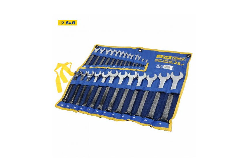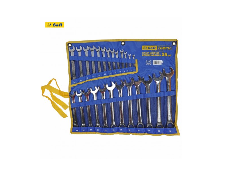 Набор ключей S&R Tempo 25 шт в тканевом свертке - предназначен для бытового и профессионального использования. Включает рожково-кидочные (комбинированные) гаечные ключи разных диаметров. Особенности набора ключей в тканевом чехле S&R Tempo 25 шт: Изготовлены ключи из прочной хром-ванадиевой стали по технологии холодной штамповки. Ключи в наборе – глянцевые. В наборе 25 ключей. Страна-производитель: Индия. Страна бренда: Германия. Комплектация: Ключи комбинированные прямые: 6, 7, 8, 9, 10, 11, 12, 13, 14, 15, 16, 17, 18, 19, 20, 21, 22, 23, 24, 25, 26, 27, 28, 28; Чехол тканевый – 1 шт.Преимущества и гарантия