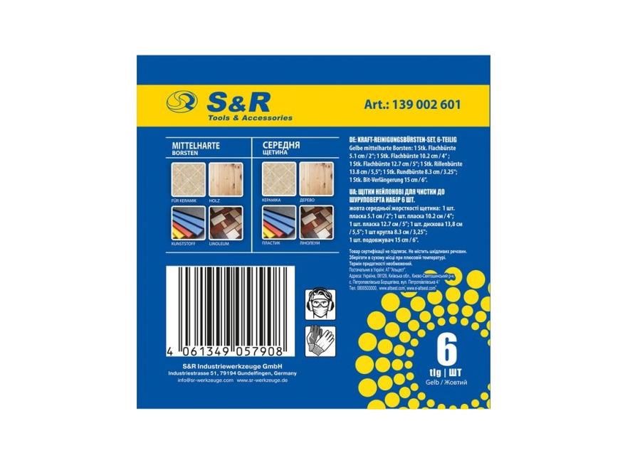 Набор щеток 6 шт, желтые нейлоновые: прямая 51 мм, 102 мм, 127 мм дисковая 138 мм, круглая 83 мм, удлинитель 150 мм S&R (139002601)