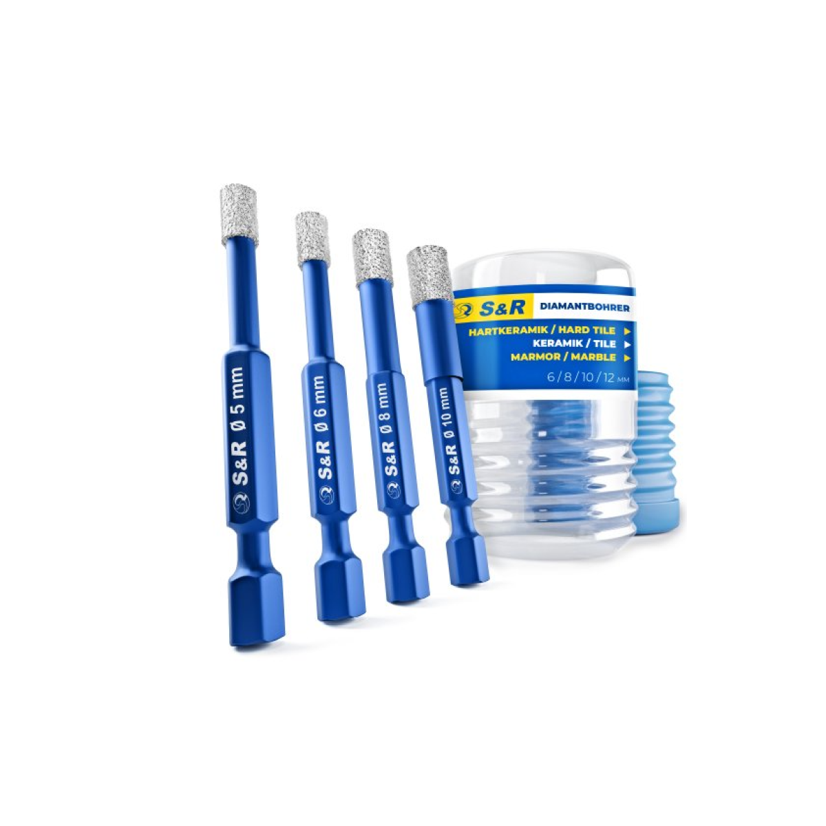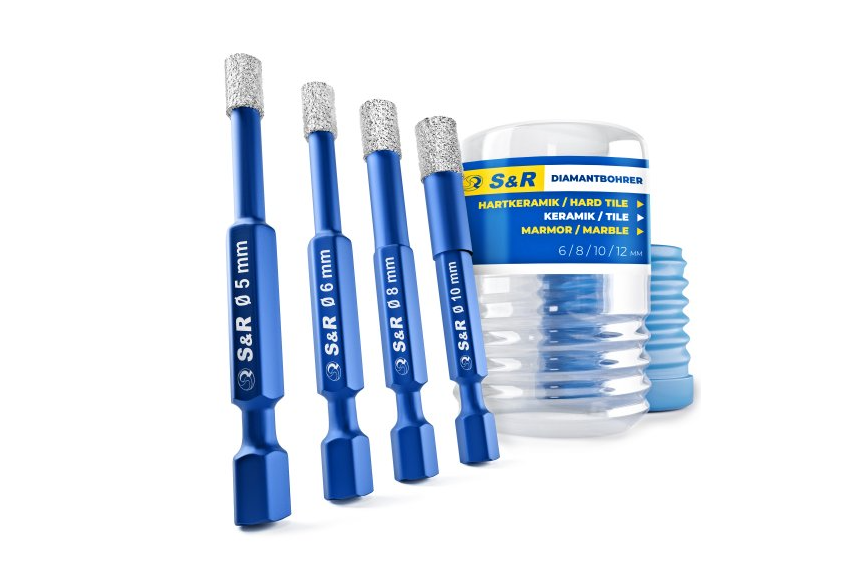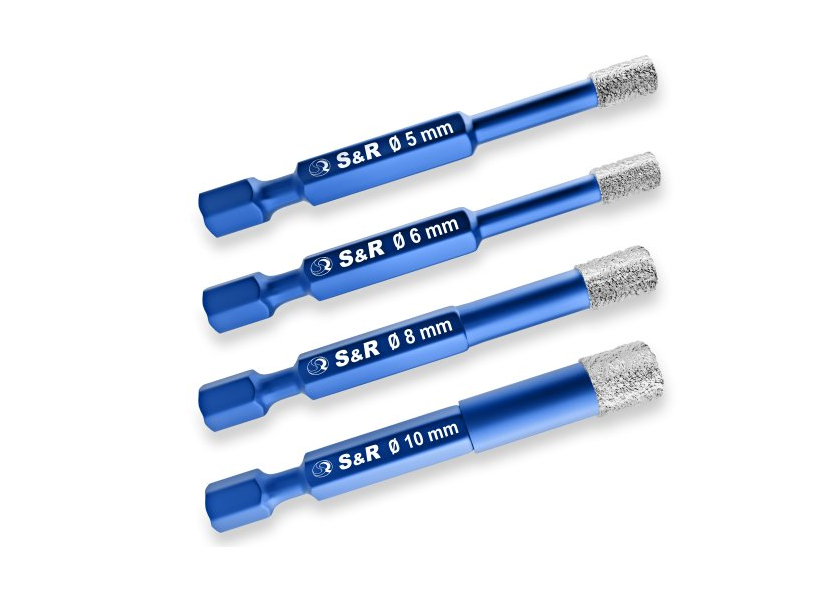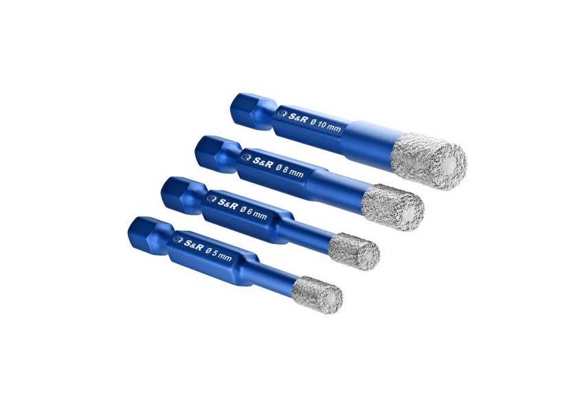 Набор сверл алмазных по стеклу и керамике, Hex 1/4", 4 шт.: 5, 6, 8, 10 мм S&R (252500004)