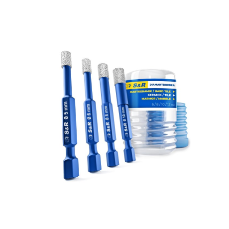 Набор алмазных сверл по стеклу и керамике S&R Hex 1/4" 4 шт. - инструмент для сверления точных и аккуратных отверстий в таких хрупких материалах, как керамическая плитка, стекло, стекловолокно, керамогранит, кварц, мрамор. Особенности набора алмазных сверл для стекла и керамической плитки СР Hex 1/4" 4 шт: Комплект включает 4 сверла общей длиной 67 мм с высотой алмазного слоя 10 мм. Сверла наполнены охлаждающим воском для уменьшения тепловой нагрузки при сухом сверлении. Допускается сухое и мокрое сверление. Хвостовик сверл - шестигранный Hex 1/4", благодаря чему можно использовать сверла вместе с большинством сверлильных патронов. В наборе сверла таких диаметров: 5/6/8/10 мм. Инструмент изготовлен с использованием термостойкого алмазного зерна. Набор поставляется в удобной пластиковой коробке с винтовой крышкой. Масса в упаковке – 0,55 кг. Страна-производитель: Китай. Страна бренда: Германия. Рекомендации по использованию алмазных сверл по стеклу и керамике: Произведите разметку места сверления. Выполните предварительное сверление, разместив сверло под углом 45° до момента появления небольшой выемки на заготовке. Предварительное сверление производите на небольших оборотах и с минимальным нажатием. Увеличьте скорость оборотов и силу нажатия. Постепенно выпрямляйте сверло, чтобы оно находилось под углом 90° относительно заготовки. Выполняйте круговые движения и налейте охлаждающую жидкость.Преимущества и гарантия