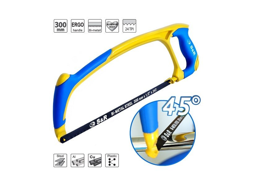 S&R 126300001 – ножовка по металлу для распила металлических изделий. Удобный дугообразный корпус из лития алюминия обеспечивает надежную установку полотна для выполнения ровного распила. Удобная эргономичная рукоятка обеспечивает комфортную работу в течение длительного времени. Прорезиненная основа рукоятки предотвращает скольжение, тем самым увеличивает безопасность пользователя. Быстрая смена полотна ускоряет работу, а также возможность установить его под углом 45°, что увеличивает разнообразие работ пилой.Преимущества и гарантия