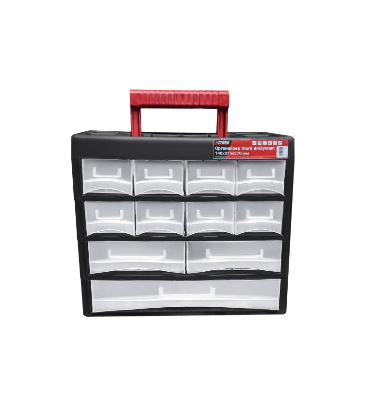 Органайзер для инструментов Stark BinSystem 140x315x270 мм – система для удобного хранения мелких деталей, креплений, инструментов и других небольших предметов. Включает 11 выдвижных ящичков, которые можно по желанию пользователя разделить специальными вставными перегородками (входят в комплект). Другие особенности органайзера для инструментов Штарк BinSystem 140x315x270 мм: Изготовлен из прочного пластика. Ящики-блоки выполнены из прозрачного пластика, что позволяет пользователю быстро находить нужный инструмент, не открывая ящик. Каждый блок имеет углубление-ручку для удобства пользования. Организатор устанавливается вертикально. Вверху на крышке органайзера расположена удобная складная ручка – для простой транспортировки всей системы хранения. В крышке есть несколько углублений для мелких инструментов, куда можно класть нужные пользователю предметы/крепления во время выполнения работ. Габариты: 140x315x270 мм.Преимущества и гарантия