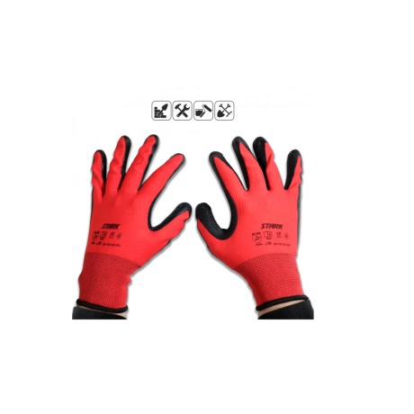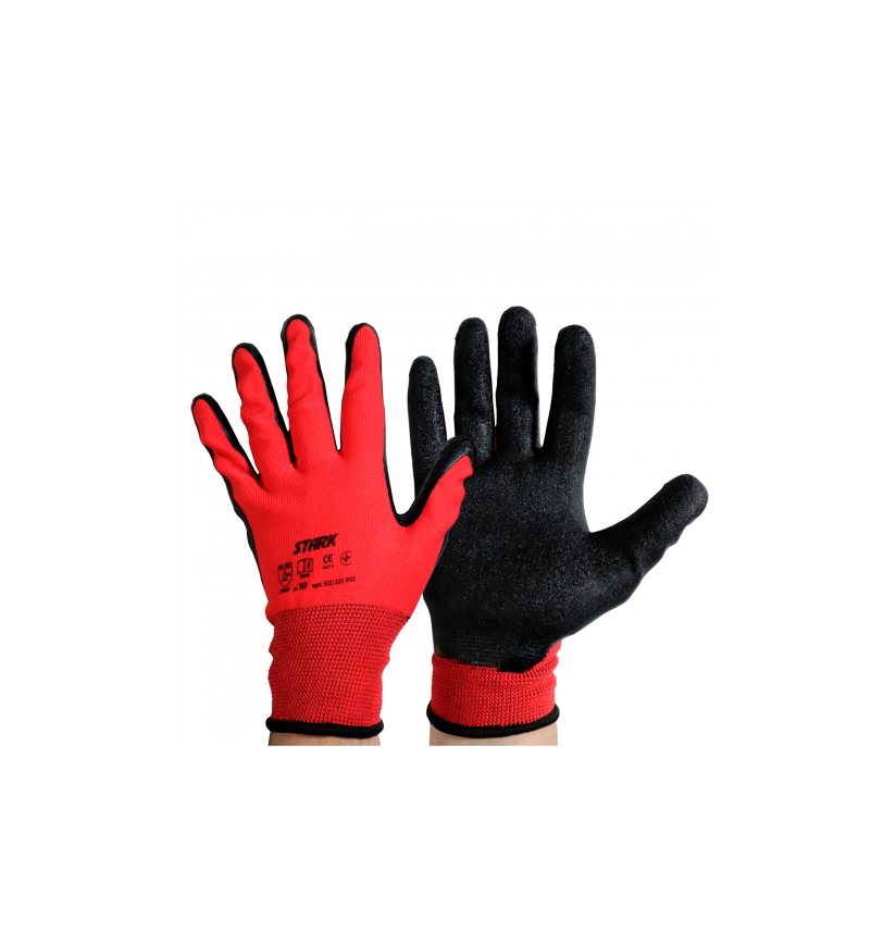 Перчатки Stark «Гейзер-13» с латексным покрытием – универсальные рабочие перчатки с латексным покрытием в области ладони. Подходят для выполнения ремонтных/строительных работ, садово-огородных работ, а также для работы на производствах, фермерских хозяйствах и т.д. Предназначены для защиты кожи рук от мелких травм, царапин, которые могут возникать в процессе работы, а также от загрязнений. Особенности рабочих перчаток с латексным покрытием Штарк «Гейзер-13»: Класс вязки – 13, это означает, что один дюйм ткани включает 13 петель, поэтому ткань достаточно плотная. Материал – полиэстер. Отличается высокой прочностью, износостойкостью, не растягивается и не выгорает. Латексное рифленое покрытие половины перчатки (область ладони). Надежный хват в сухой и влажной среде. Цвет ткани – красный, цвет латексного покрытия – черный. Бесшовные, что обеспечивает комфорт использования. Сохраняется высокая чувствительность пальцев. Размер – 10 (XL).Преимущества и гарантия